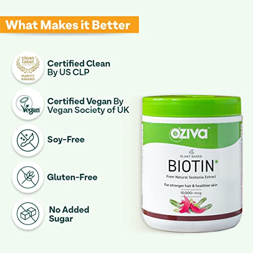 • WHOLEFOOD BIOTIN SUPPLEMENT FOR HAIR GROWTH: OZiva Plant Based Biotin for hair contains 10000 mcg of 100% natural Biotin derived from Sesbania Agati extracts. The proprietary blend of SesZenBio in this Biotin helps stimulate hair follicles up to 2 times t
