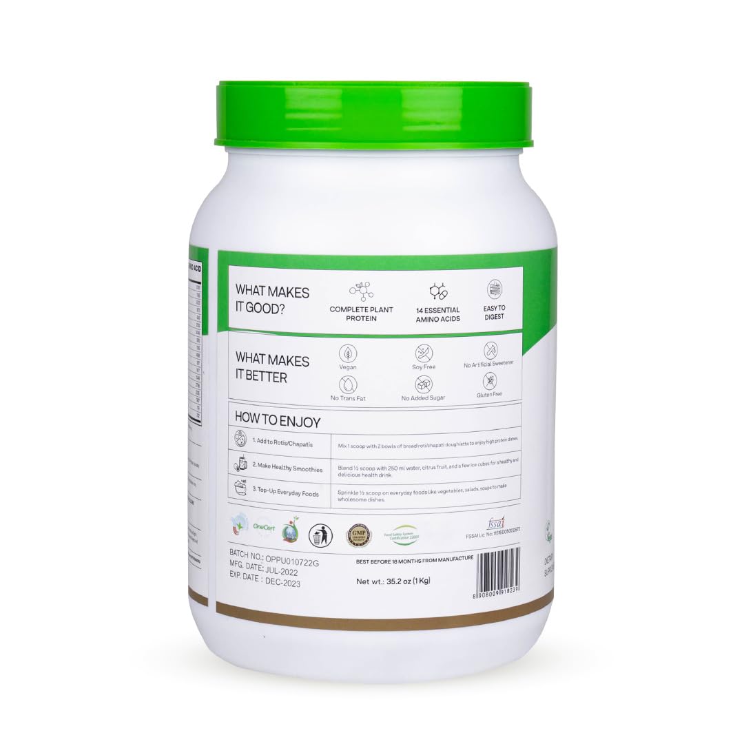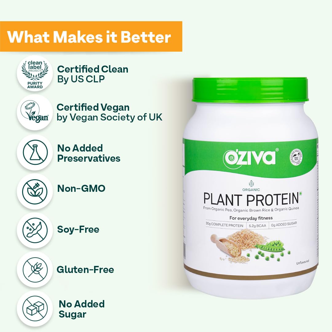OZiva Organic Plant Protein Powder for Men & Women Unflavored 1kg (30g Vegan Protein Organic Pea Protein Isolate + Organic Brown Rice Protein Soy Free) for Daily Fitness