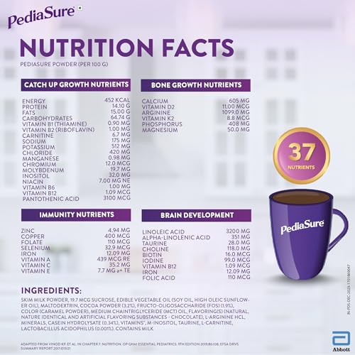 FOR HEIGHT AND WEIGHT GAIN: PediaSure as a nutritional drink for kids is formulated with advanced growth nutrients Arginine Vitamin K2 High Quality Protein Calcium Vitamin D Iron and Iodine to support catch-up growth.
