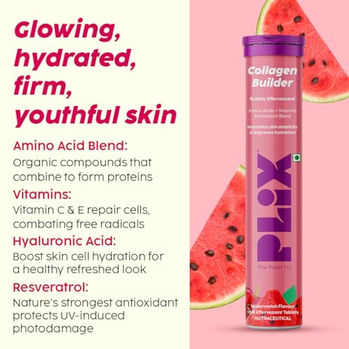 PLIX - THE PLANT FIX Collagen Builder Bubbly Effervescent - 15 Tablets (Pack of 8, Watermelon) for Hydrated Skin & Anti-Aging | Amino Acid Blend For Collagen Production | Vitamin C & E | 100% Vegan