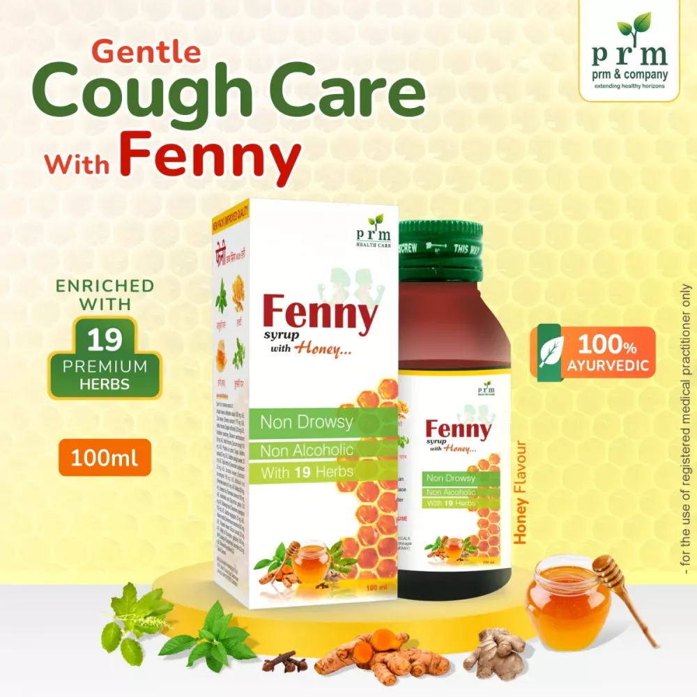 PRM & Company present to you a authentic Ayurvedic throat infection & cough care syrup for all age Fenny cough Syrup with Honey. Fenny Cough Syrup enriched with 19 ancient herbs namely Haldi rhizome, Tulsi leaves, Ardusi leaves, Pudina Pan, Nilgiri Oil, lavang oil, Somlata Leaves, Honey and many more