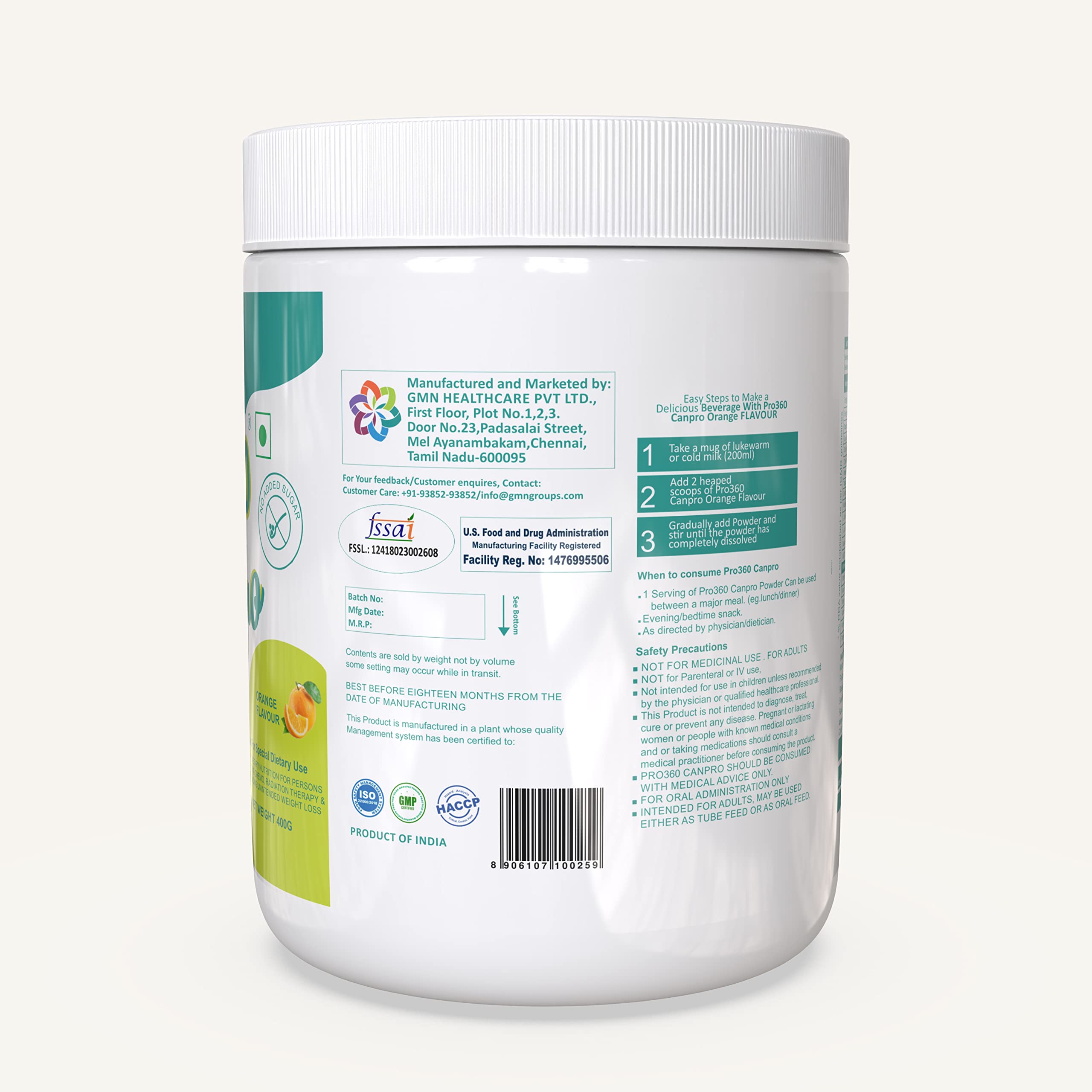 Total Weight: 400 gm; Package Contents: 1 canpro nutritional protein drink. Storage Instructions: Store the container of Pro360 CanPro in a cool dry place away from heat light and moisture. Ensure that the lid is closed tightly after use. Once opened use