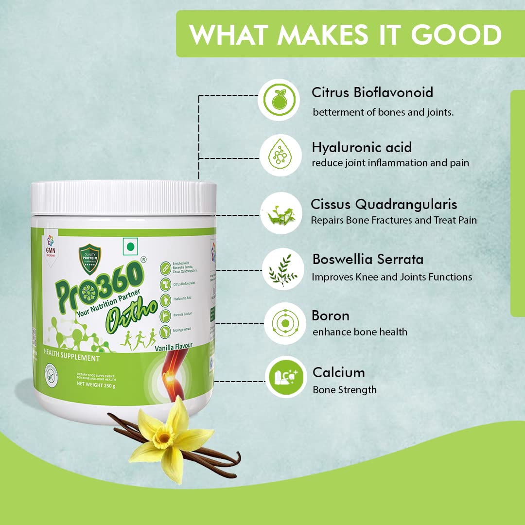 Pro360 Ortho Protein Powder for Bone and Joint Health | 250g Protein Supplement for Orthopedic Care with Natural Herbal Extracts | No added Sugar Vanilla 250g (Pack of 1)