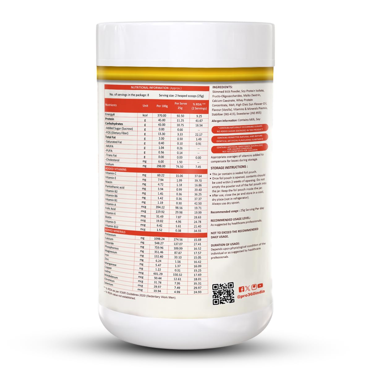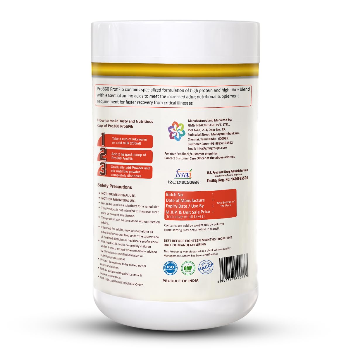 Pro360 Protifib HPHF High Protein High Fiber is scientifically formulated specialized adult nutrition supplement powder to meet the increased needs for faster recovery from critical illness. No added sugar formula which supports diabetes persons also 45g of High Protein - Supports immune function and wound healing and helps to restore body protein 13g of High Fiber - Contains Prebiotic FOS fiber which supports bowel movements and digestion Immuno Nutrients - Enriched with Iron Folic Acid Zinc Vitamin A B6 and B12 which improves the immunity function of the body Antioxidants - Contains Vitamin C Vitamin E and Selenium which gives protection from free radicals. Suitable for Enteral Feeding (Tube Feed) only under strict physician's or dietician's supervision or guidance. Directions to use: Take a cup of 200ml preboiled cooled water or milk and add 2 scoops (25g) of powder and mix well without any lumps and consume immediately