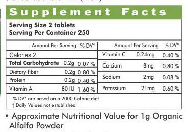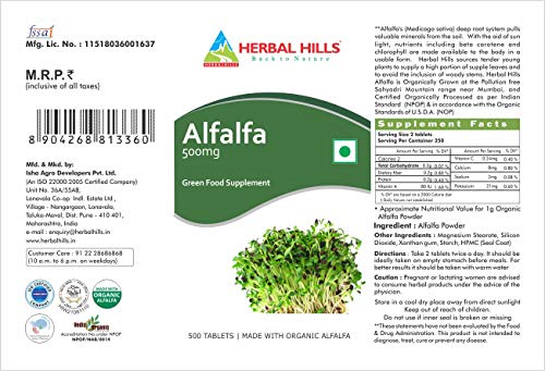 Alfalfa - 500 Tablets Super Saver Pack . Manufactured by: Isha Agro Developers Pvt. Ltd. . Dosage: Take 2 tablets twice a day for maintaining good health. It should ideally be taken on empty stomach before meals. For better results it should be taken with warm water.