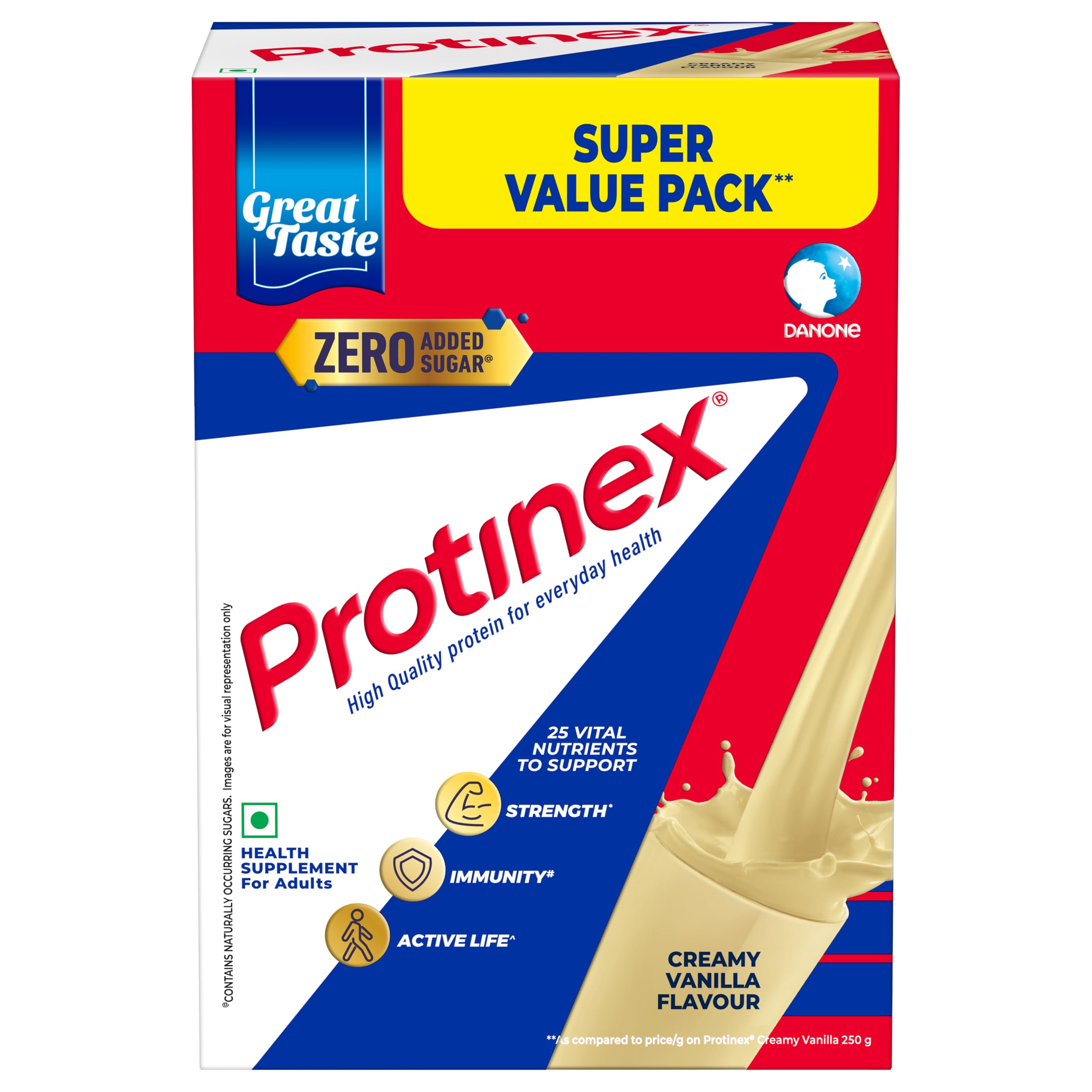 Protinex Creamy Vanilla is a vegetarian nutritional beverage mix that should be consumed daily as part of a healthy lifestyle for your everyday health. It is now clinically proven for strength and energy. It increases your strength and energy nutrients by 34%. With a rich legacy of over 65 years Protinex comes with high protein content (34g for every 100g) that helps you fight tiredness + fatigue and delights you with its rich creamy taste! Lack of protein leads to loss of muscle strength which in turn leads to frequent tiredness and fatigues in our daily lives. Protein makes up about 50% of muscles & bones in our body and our body cannot store protein â hence it needs to be consumed daily! Protinex helps in bridging this gap of protein and other essential nutrients in regular Indian Adult diets. Protinex should be consumed daily as part of a healthy lifestyle for everyday health. Protinex Creamy Vanilla is also enriched with calcium vitamin D and immuno-nutrients for your everyday health helping with stronger muscles & bones long-term immunity and stamina to power through each day.