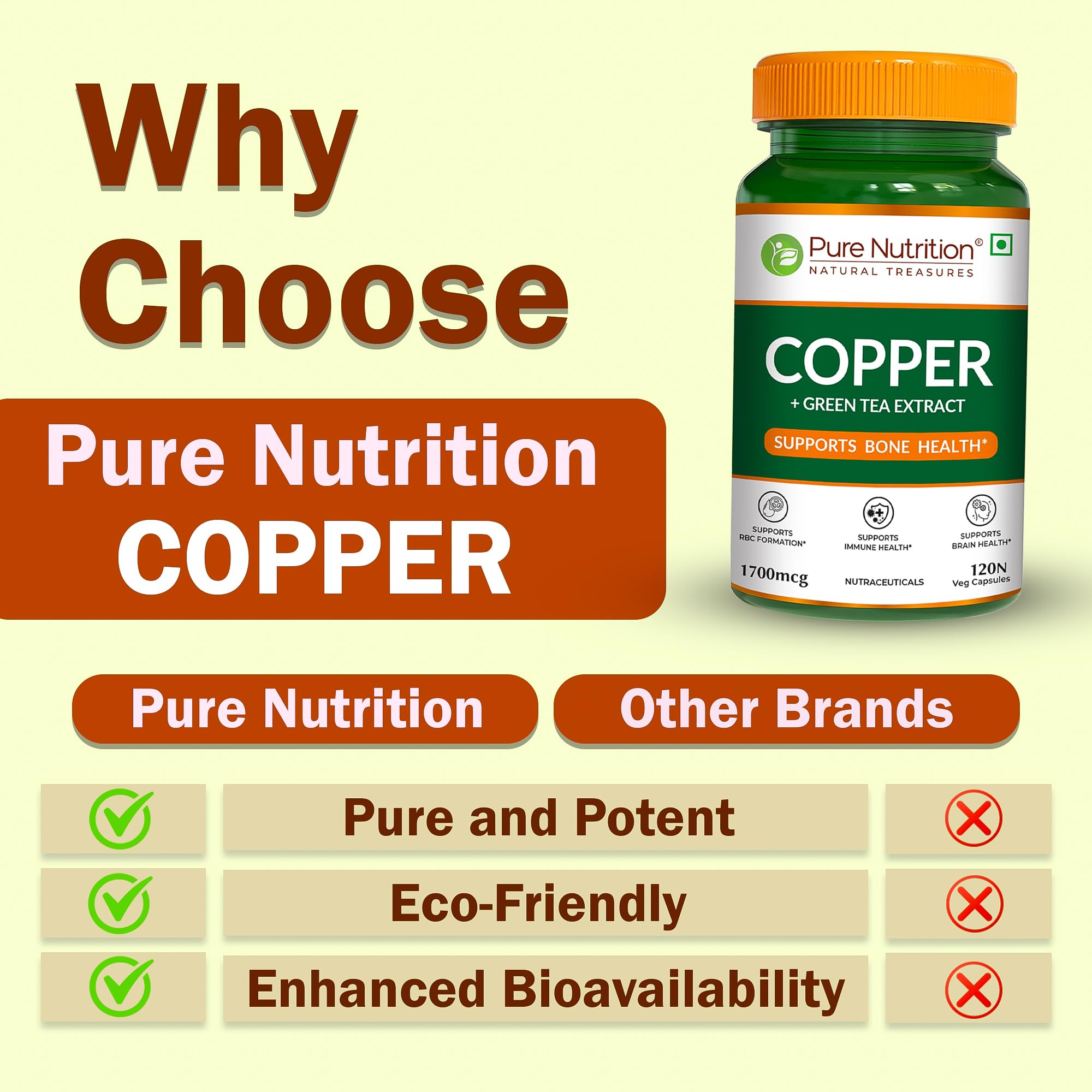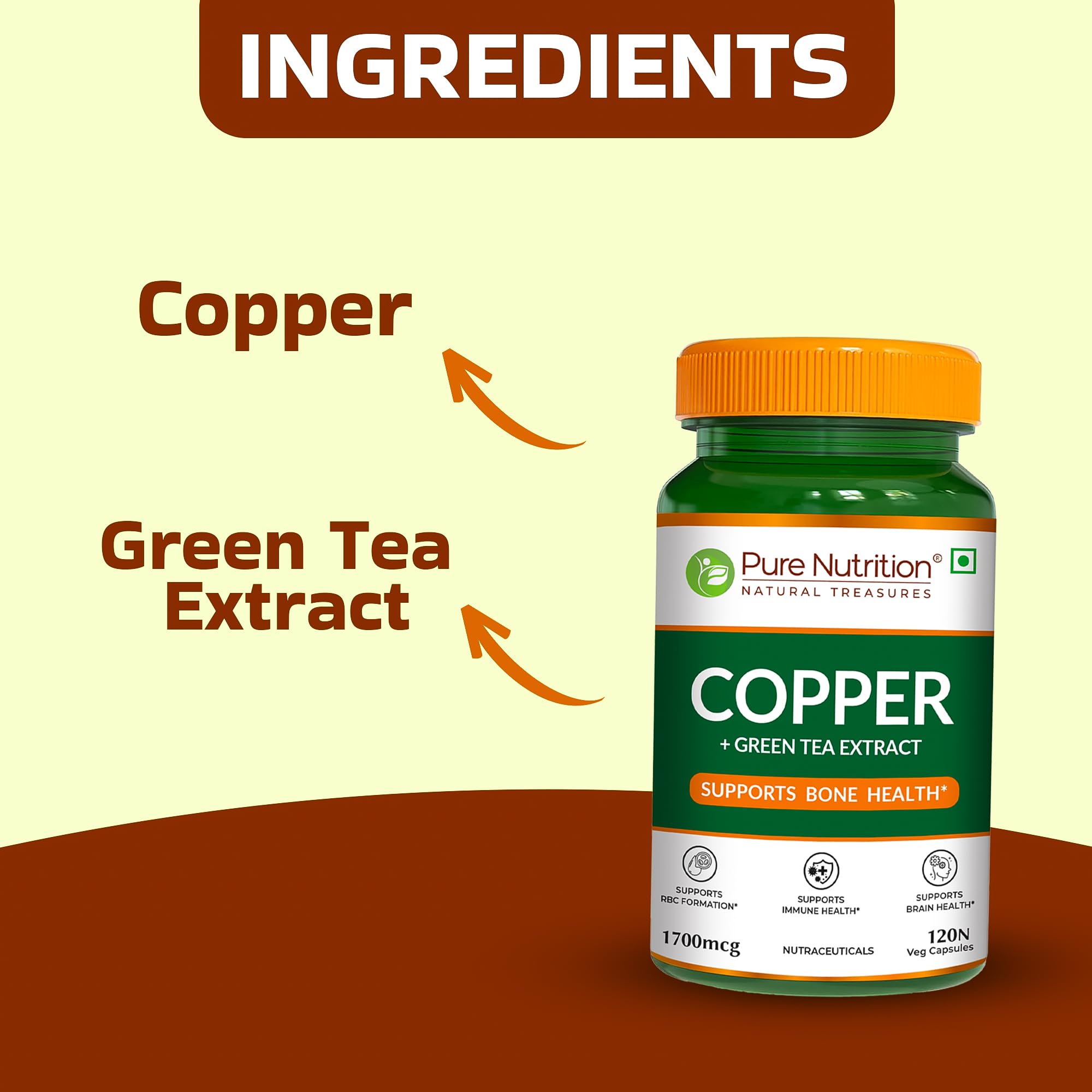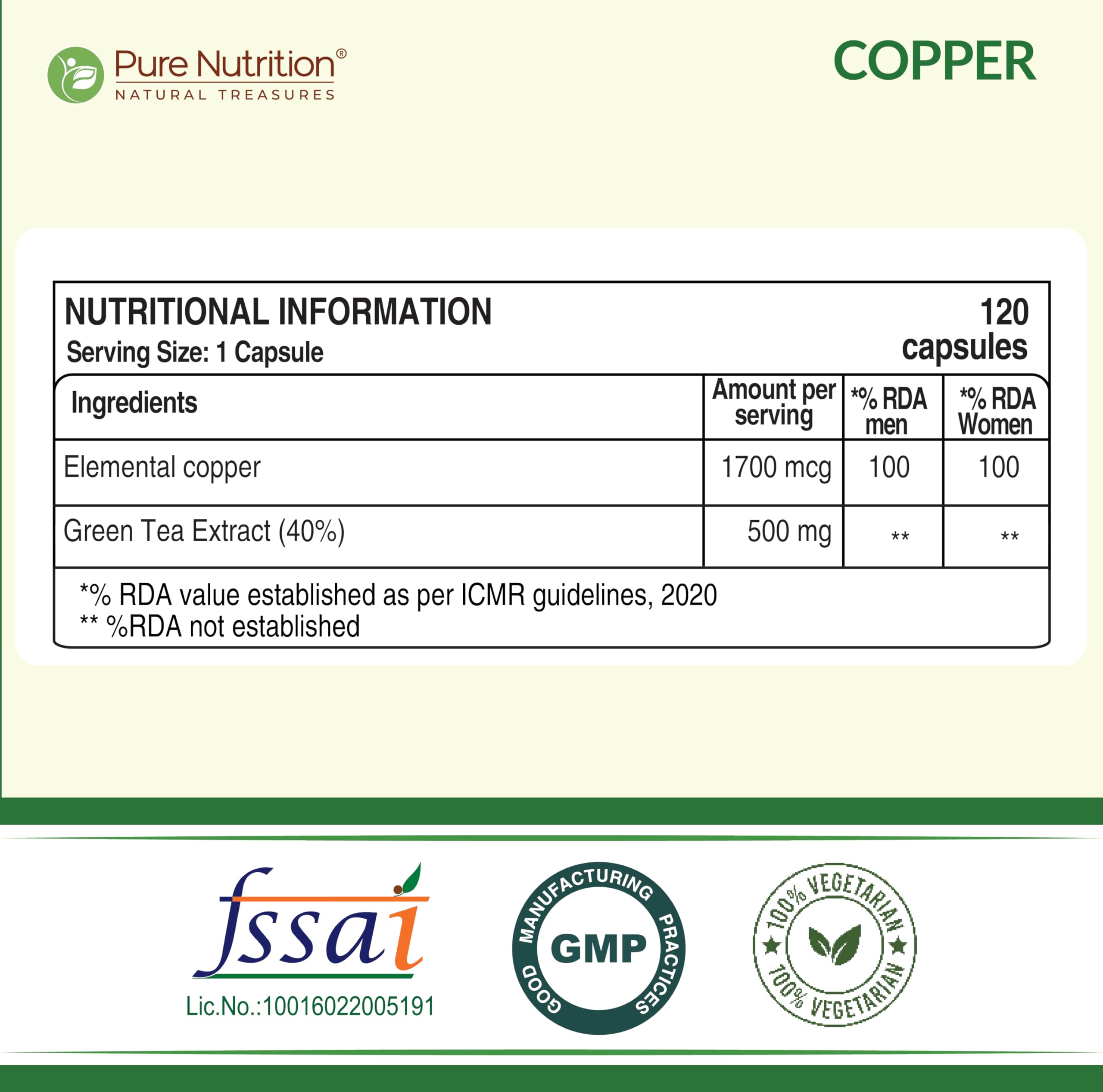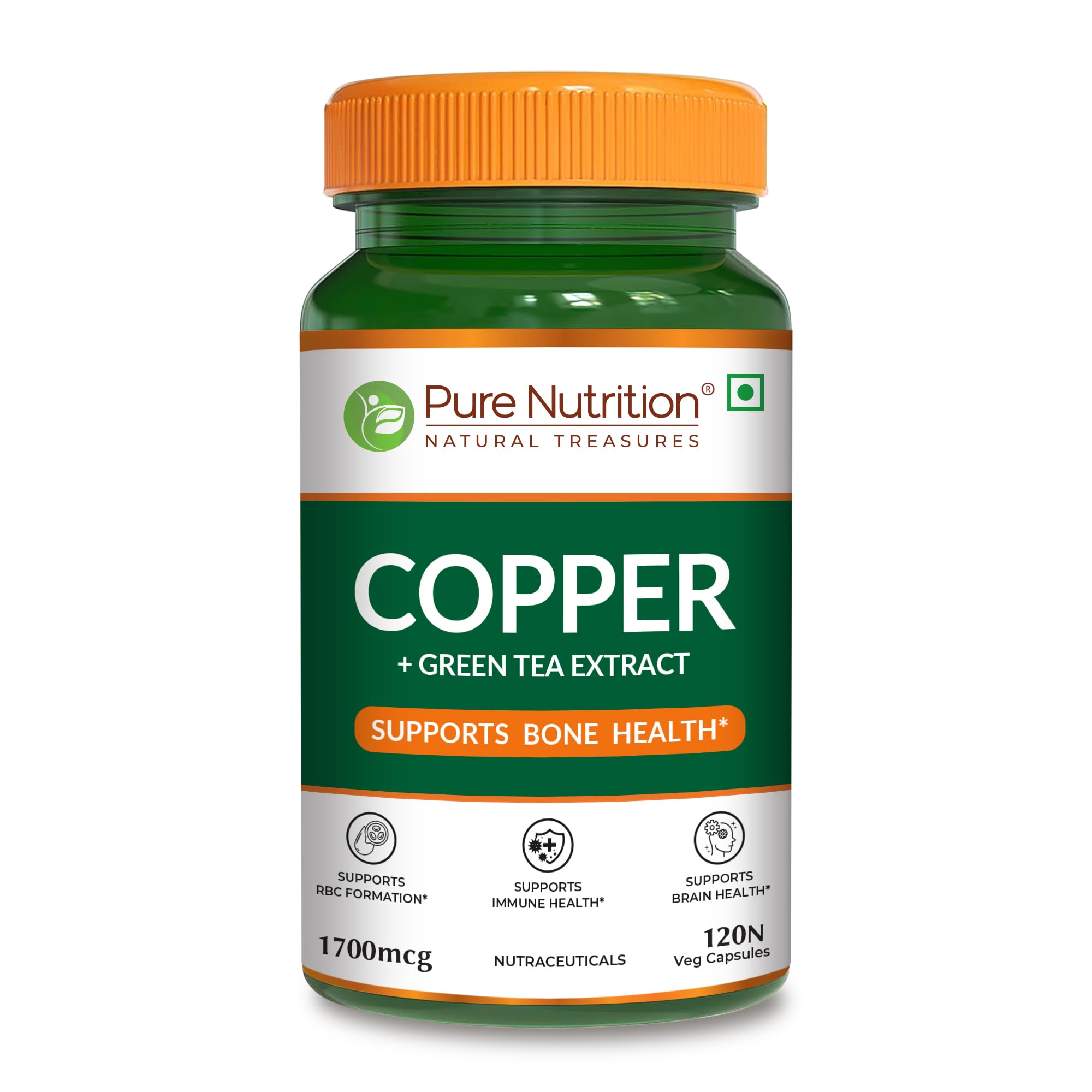 Support your daily wellness with Pure Nutrition Copper Supplement delivering 1700mcg of copper per serving. Enriched with green tea extract it helps promote immune health brain function and connective tissue support. Formulated in easy-to-swallow vegetarian capsules this supplement is ideal for both men and women. Made with high-quality ingredients to meet safety and purity standards.