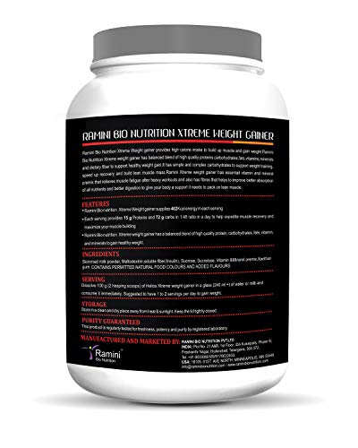 Ramini Bionutrition Xtreme gainer provides high intake to build up muscle and gain . Ramini Bionutrition Xtreme gainer has balanced blend of high quality proteins carbohydrates fats vitamins minerand dietary fiber to support healthy gain