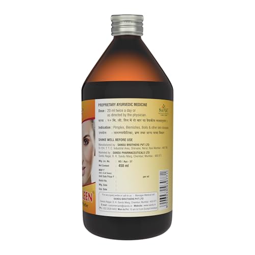 Size:450 ml (Pack of 1)Hemocleen is an excellent blood purifier with goodness of khadir manjistha to improve skin texture tone and lustre. It is the best and effective ayurvedic polyherbal tonic for acne and pimples. It prevents skin discoloration pigmentation and black spots caused due to excessive sun exposure. It nourishes the skin & protects it from the effects of bacterial and viral infections. It not only arrests the recurrence of pimples but also helps to delay skin ageing. It reduces excessive dryness and maintains adequate hydration of the skin. Hemocleen is also the best medicine for various skin disorders. About Brand:- Sandu Pharmaceuticals also popularly called Sandu Ayurveda by people is one of the renewed/ reknowned brands when it comes to Ayurvedic health care products or medicines. Sandu Ayurveda Medicines are backed by a rich heritage and more than 120 years in the manufacture and marketing of Ayurvedic medicines. Sandu is an ISO 9001:2000 certified group of companies. It is the best place to explore the world of Ayurveda ayurvedic medicines and to buy medicines online. Ayurveda has been a part of the great heritage of Indian science. During British rule Ayurveda was not considered an idealistic way of medicine and was looked down upon by modern classes but it was during these adverse times that a few inspired people staked their lives to restore glory to this magnificent legacy. The name Sandu¢ leads in this roll call of honour. On 10th May 1899 Sandu Brothers chose to reinvent the manufacturing of Ayurvedic medicines. Their commitment to spread and educate about the goodness of Ayurveda and bringing health even to the poor are the ideals that have been the foundation of their success. The name Sandu now stands as a benchmark of quality amongst doctors practitioners and common people alike.