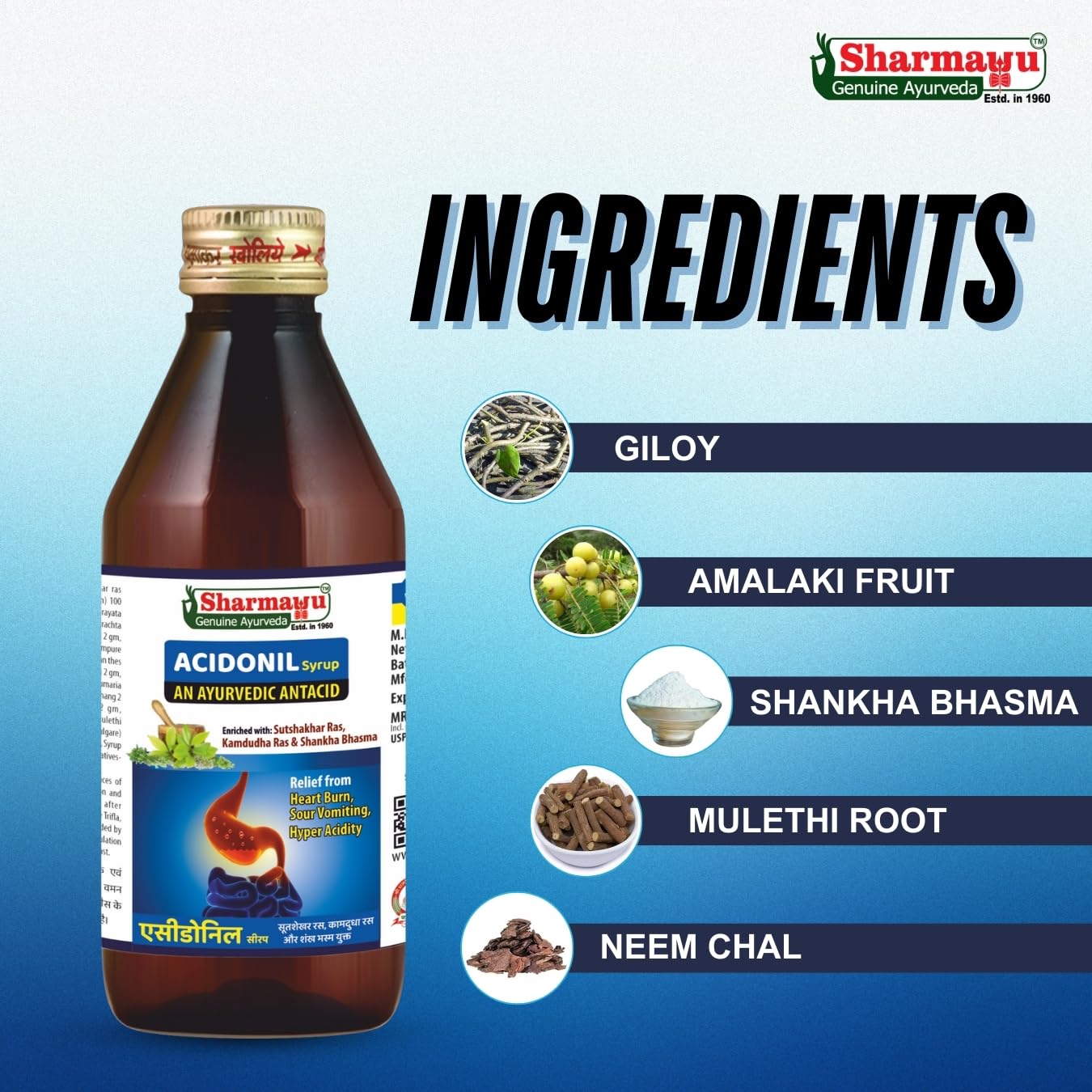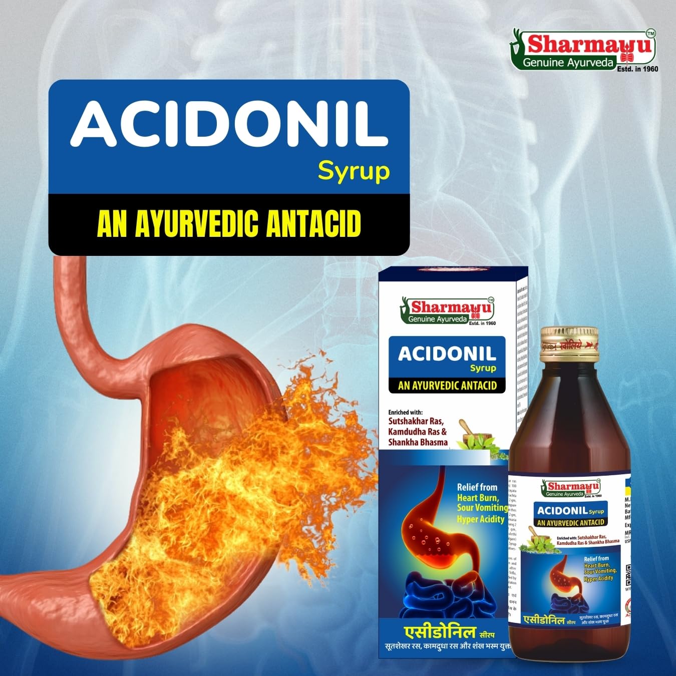 Say goodbye to the discomfort of acidity and heartburn with Acidonil Syrup – a powerful Ayurvedic antacid formulated to naturally relieve hyperacidity gastric irritation gas and related digestive issues. Crafted using time-tested Ayurvedic herbs Acidonil works by neutralizing excess stomach acid soothing the inner lining of the stomach and promoting healthy digestion. It is effective in managing gas acid reflux peptic ulcers duodenal ulcers bloating and that persistent burning sensation in the stomach. Whether you're dealing with chronic acidity or occasional heartburn Acidonil Syrup offers a gentle yet effective solution – without the side effects of chemical antacids. ???? Key Benefits Provides fast relief from acidity heartburn gas & bloating Helps in the treatment of hyperacidity and hyperchlorhydria Effective against gastric and duodenal ulcers Reduces the feeling of nausea and fullness in the abdomen Supports the body’s natural digestive balance 100% Ayurvedic & natural safe for long-term use