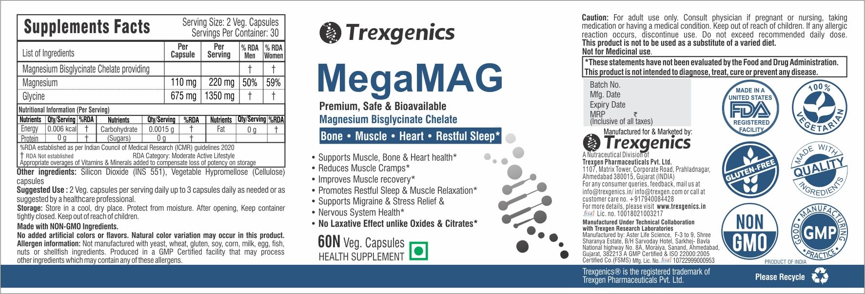 Trexgenics MegaMAG is a premium & most bioavailable form of Magnesium as Bisglycinate. MegaMAG provides the high absorption benefits of Magnesium and added benefits of Glycine without any side effects of other low bioavailable forms of magnesium like Diar