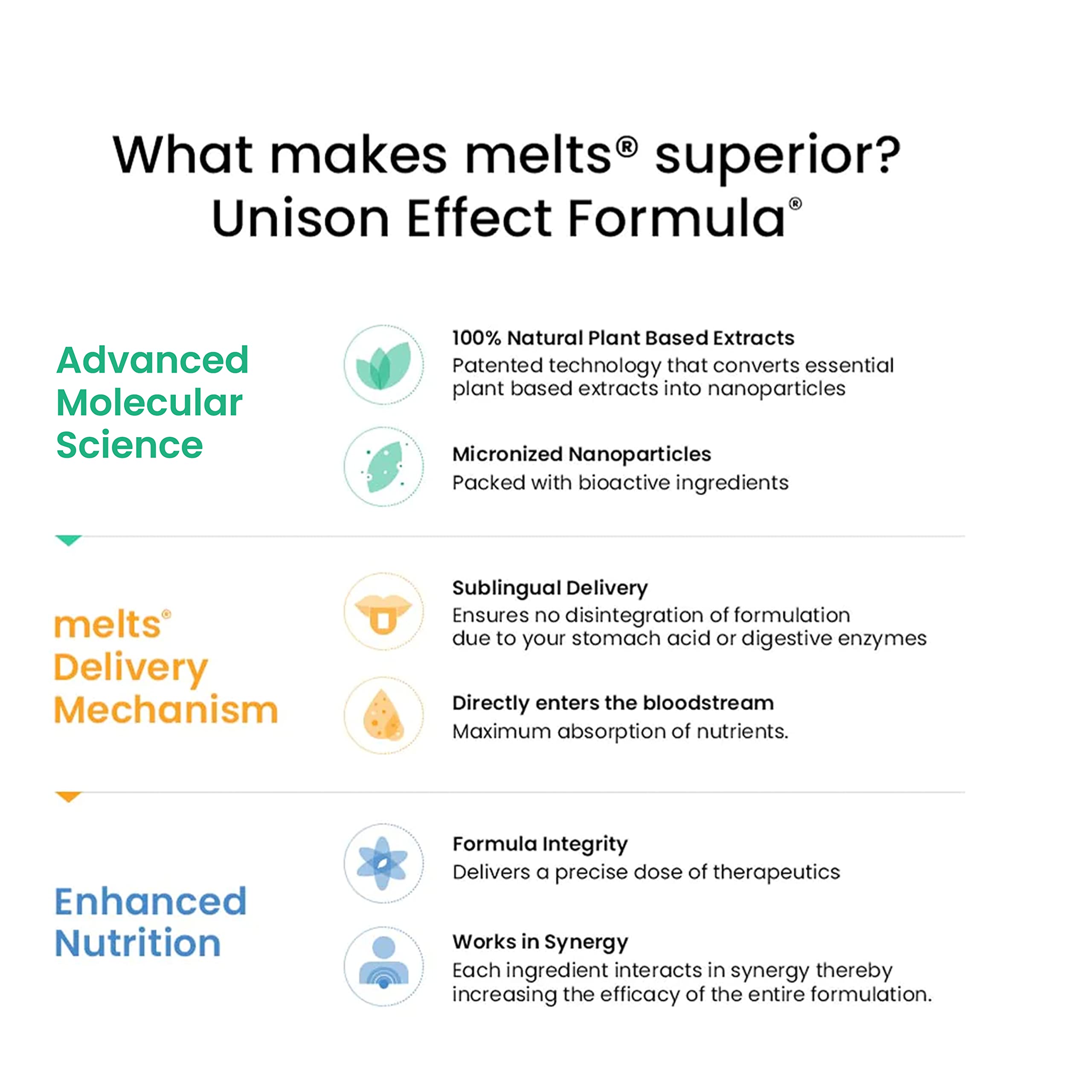 • Advanced German Nano Science: Fast-acting and all-natural melts are more bioavailable than traditional tablets/capsules/sugar-filled gummies. Our Patented Nano technology converts plant extracts into nanoparticles and the sublingual quick dissolve deliver
