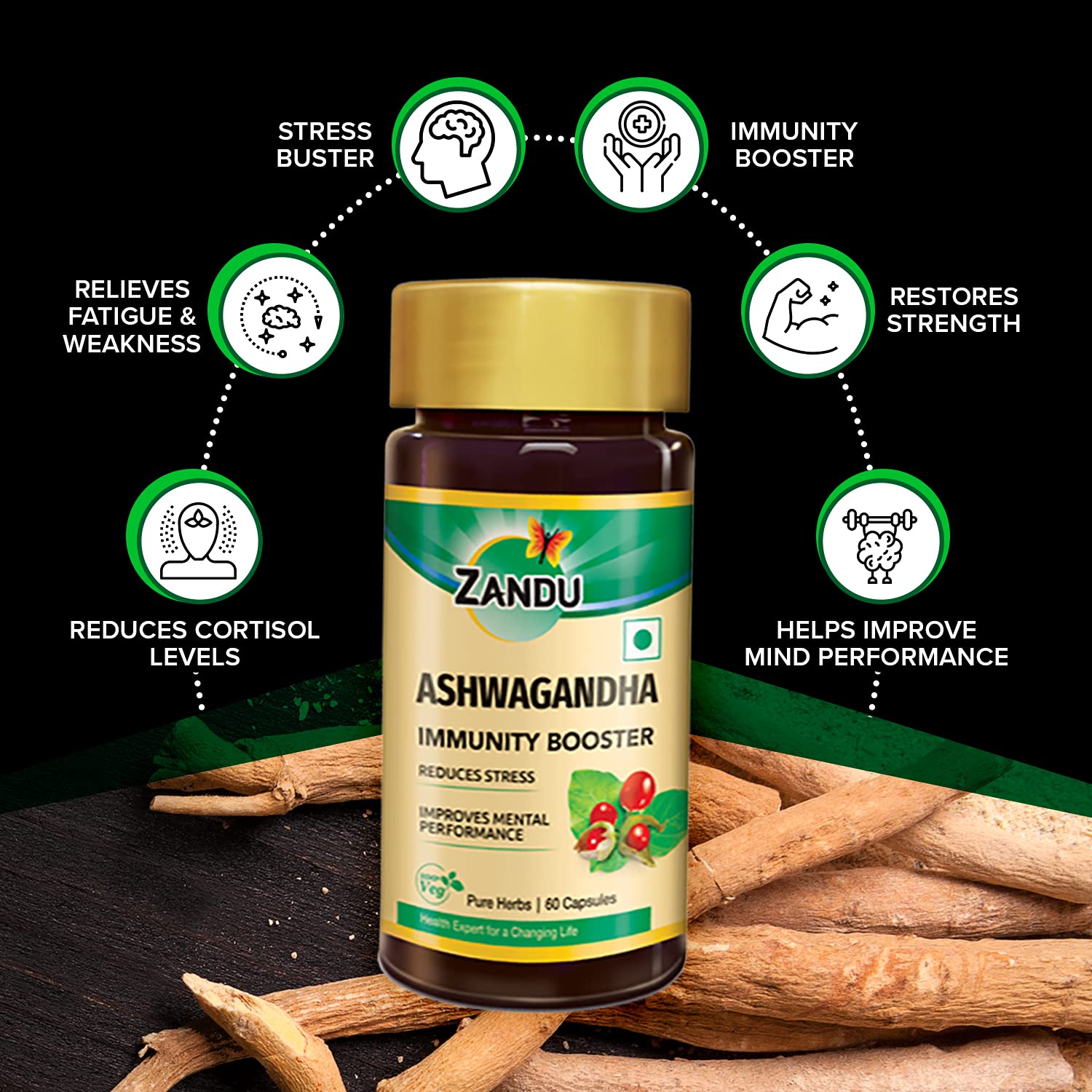 Zandu Ashwagandha Capsules With Goodness of Natural Extracts of Ashwagandha Helps Boost Immunity and Useful for Natural Body Strength Stress Buster - 60 Veg capsules
