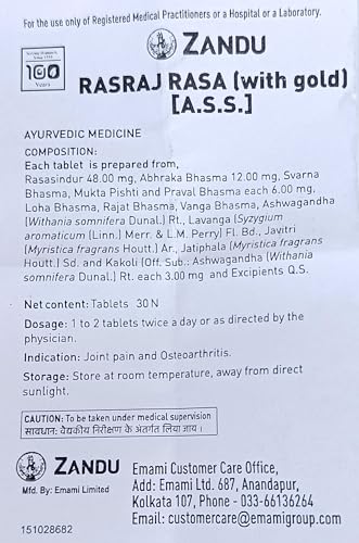 Zandu Rasaraj Rasa Suvarna Yukt (With Gold) 30 tab