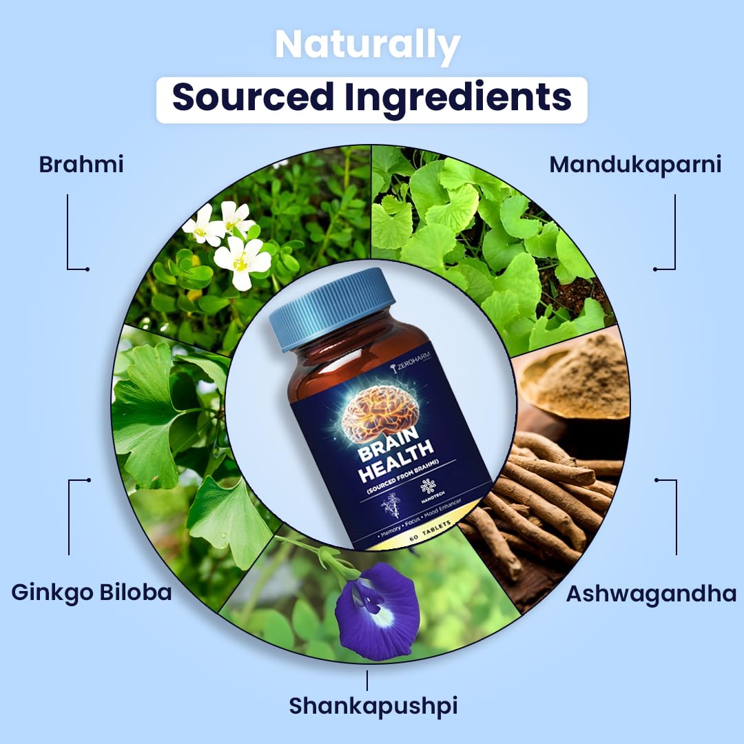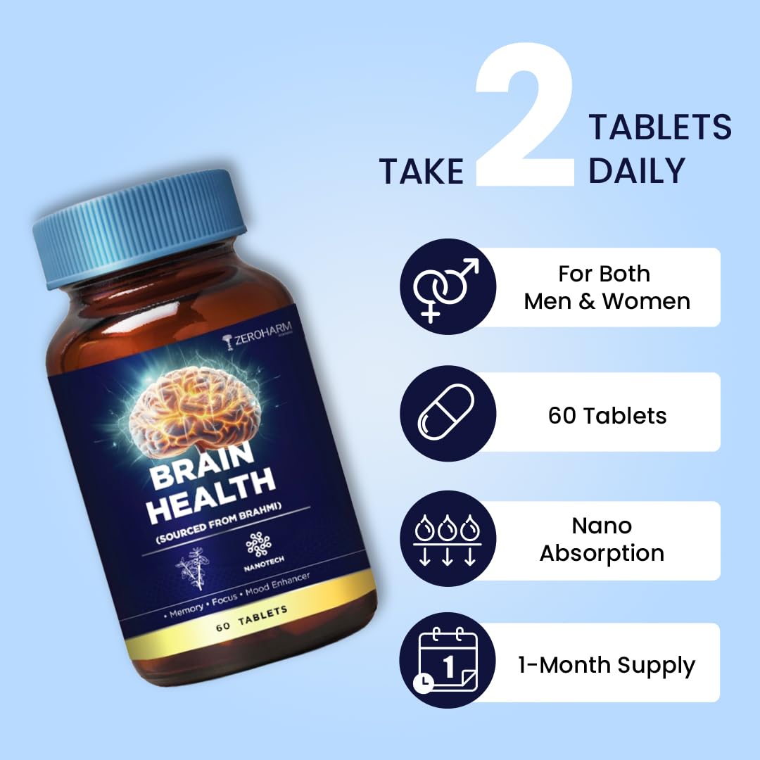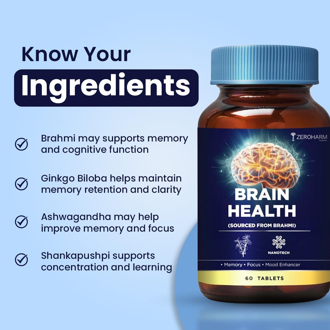 ZEROHARM Brain Health Supplement for Focus Memory & Mental Clarity | With Brahmi Ginkgo Biloba Ashwagandha | Cognitive Support Concentration| Boosts Memory for Kids Students Adults | 60 Tablets