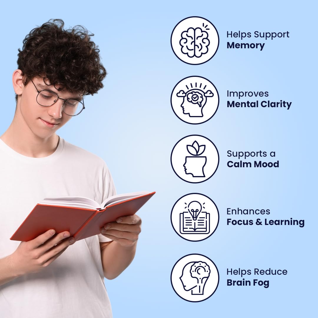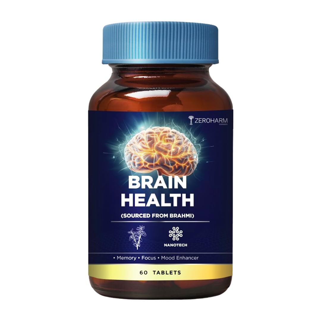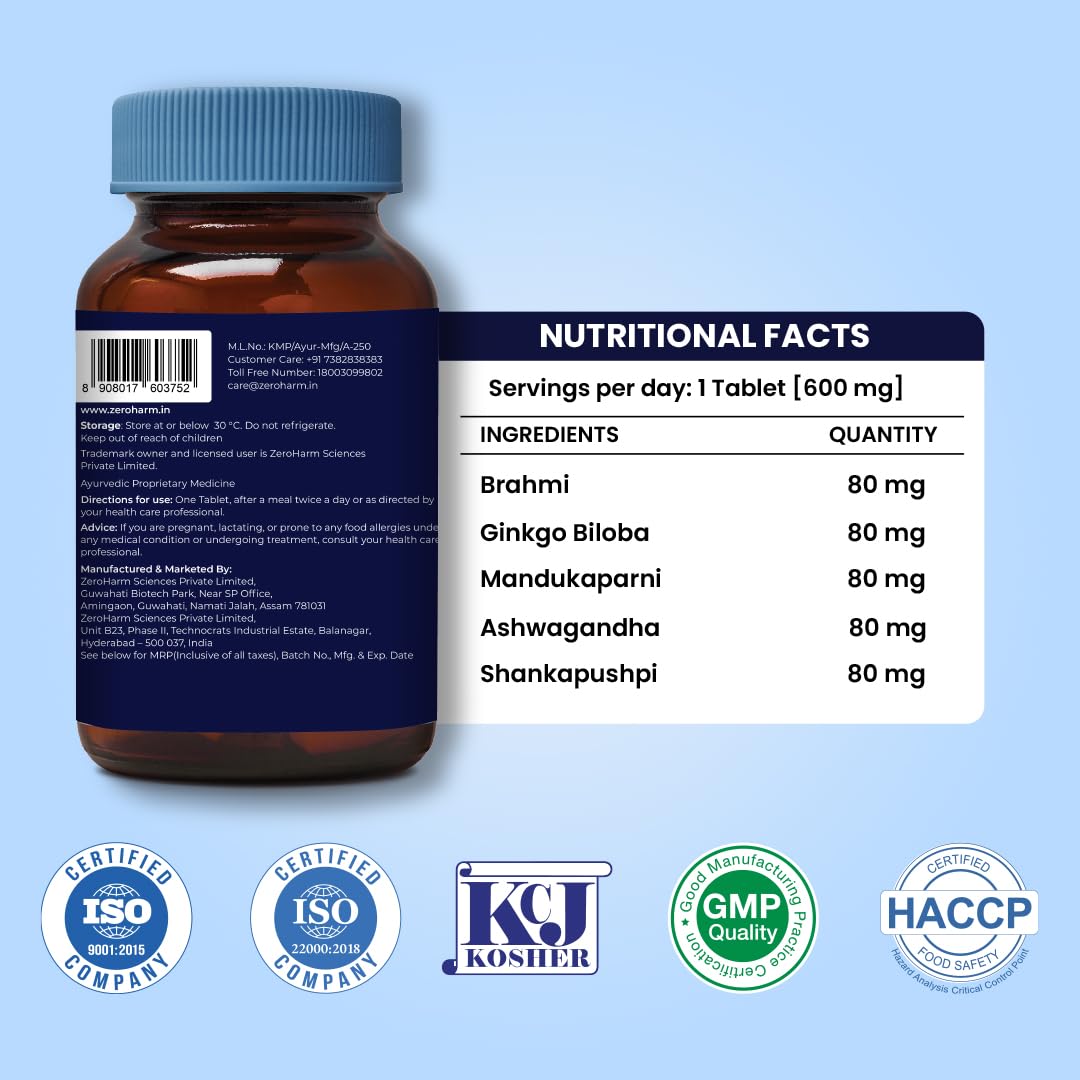 ZEROHARM Brain Health Supplement for Focus Memory & Mental Clarity | With Brahmi Ginkgo Biloba Ashwagandha | Cognitive Support Concentration| Boosts Memory for Kids Students Adults | 60 Tablets