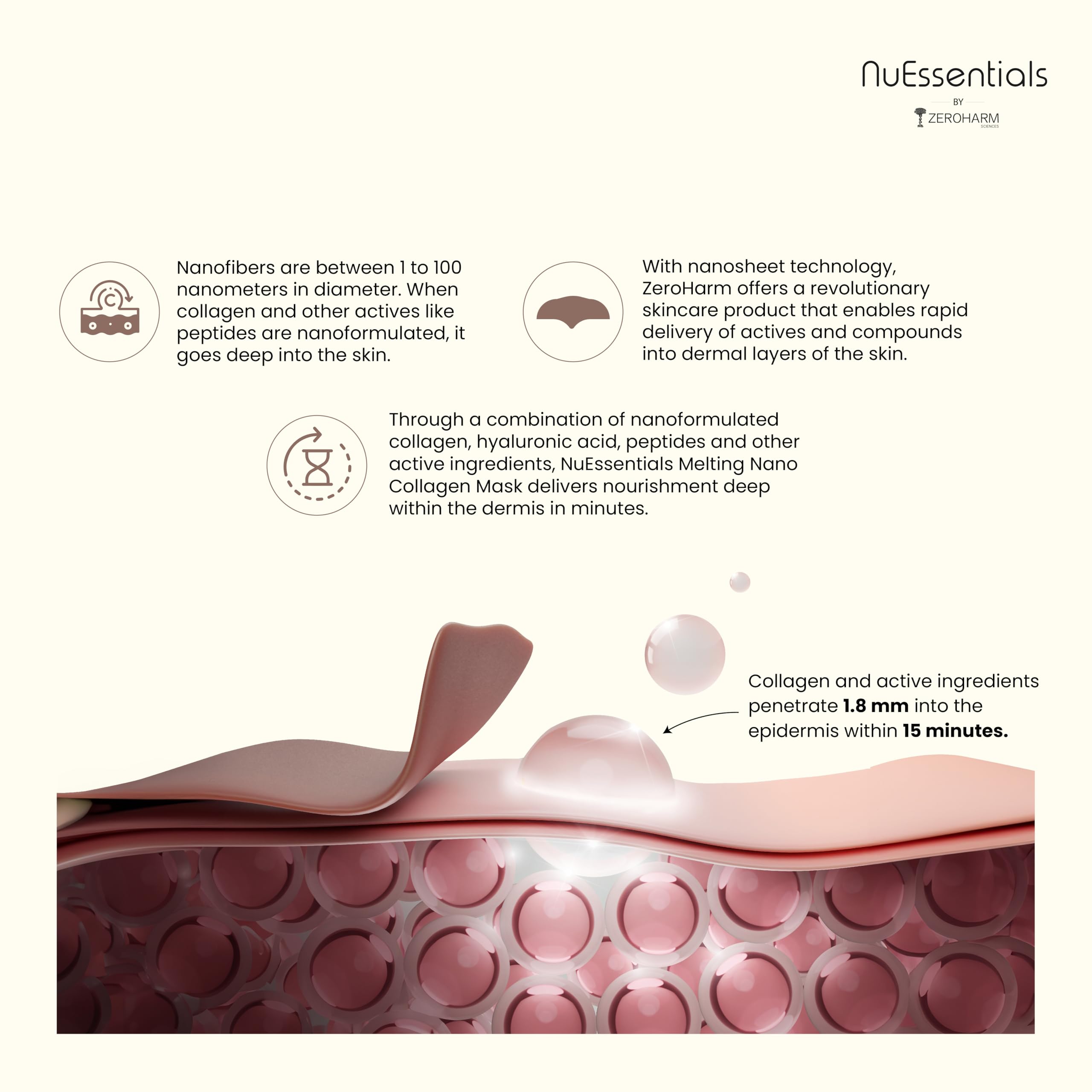 ADVANCED NANOTECHNOLOGY: NuEssentials Nano Mask is a unique collagen-soluble film that sets it apart from ordinary face masks. Within minutes of application the collagen film rapidly dissolves releasing age-defying actives and hydration deep within the sk