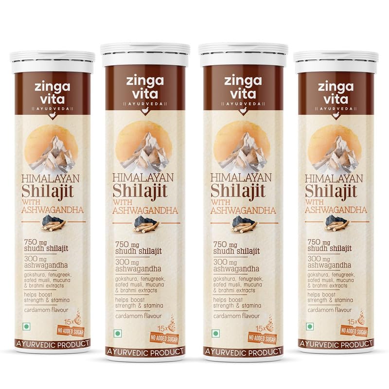 Zingavita Ayurveda Himalayan Shilajit (750mg) Effervescent With Ashwagandha Gokshuru Fenugreek Brahmi and Safed Musli for Strength Performance & Muscle recovery Cardamom Vegetarian - Pack of 4