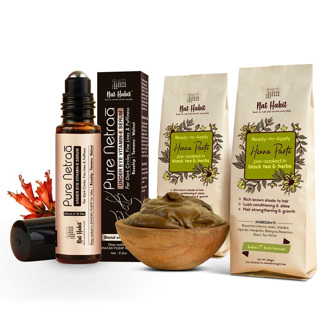 Nat Habit Ready-To-Apply Henna Paste & Pure Netraā Serum - Dhataki Soaked UnderEye Care The Ideal Combo For Conditioned Hair, Healthy Scalp, Eye Care & Hair Fall with Rich Dark Brown Color (Combo Pack of 3)