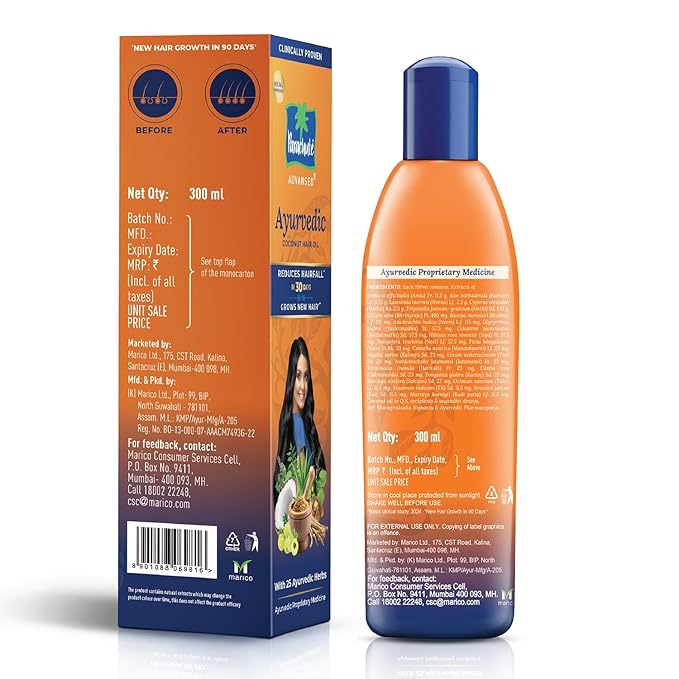 Parachute Advansed Ayurvedic Coconut Hair Oil is a combination of coconut and 25 ayurvedic herbs, which works as a highly effective Ayurvedic remedy for hair fall and new hair growth. Clinically proven to reduce hair fall in 30 days and boost new hair growth in 90 days, this ayurvedic hair oil contains ingredients such as Bhringraj, Amla, Neem, Brahmi, Methi and more. This ayurvedic oil for hair fall is processed using the ancient ayurvedic method called Tel Pak Vidhi, wherein a concoction of herbs is cooked in oil, ensuring maximum infusion of nutrients present in the herbs. This Ayurvedic solution for hair fall has proven efficacy in controlling hair fall, and causing new hair growth.