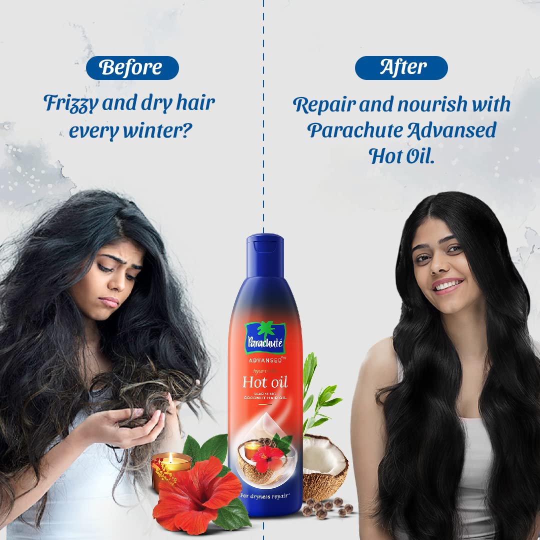 Parachute Advansed Ayurvedic Hot Oil 400 ml with Free 90 ml PackParachute Advansed Hot Oil is enriched with the Goodness of both Coconut oil & Ayurvedic ingredients like Thyme Malkangini and Hibiscus which gives Hair the extra nourishment it needs. This pure coconut oil enriched with Malakangani and Piper Nigrum deeply conditions your hair leaving it soft and manageable. While thyme aids hair growth. It has special Warming Oils that penetrates deep into roots. It nourishes your hair from within and repairs dryness even in the harshest winters. Give dry and unmanageable hair the magic of warmth with Parachute Advansed Hot Oil for healthy frizz free hair. Hair care tip gently massage into your hair and scalp. The warmth goes up the pores and the hair oil soaks in. Wash it off for beautiful lustrous hair. Parachute advansed by Marico stands for care nurturance and beauty and tries to fulfil the needs of its myriad consumers through various offerings in the portfolio spanning hair care. Parachute advansed brings the coconut oil in multiple variants advanced gold hair oil ayurvedic hair oil advansed aloe vera coconut hair oil and advansed jasmine hair oil.Parachute Advansed Deep Nourish Body Lotion for Women & Men Dry Skin 250ml | Pure Coconut Milk 100% Natural 72h MoisturisationGet naturally beautiful and glowing skin this winter with Parachute Advansed Deep Nourish body lotion for women. This is our original patented formulation especially crafted for extra dry skin. Enriched with goodness of Pure Coconut Milk & 100% Natural moisturizers It provides deep nourishment and intensive moisturization to skin even in the harshest weather. It penetrates 10 layers deep into the skin to restore lost moisture and repair dry and damaged skin. This quick absorbing body lotion has a light non greasy texture that conditions and softens your skin without leaving behind any residue. Its mild fragrance will make you feel refreshed and rejuvenated. Coconut Milk is a miracle ingredient known for its nutritive and transformative effect on skin. It moisturizes and soothes skin from within restoring lost moisture and helps in repair of dry and irritated skin. The entire range of Parachute Advansed Body lotions is derived from nature and contains 100% natural moisturizers. It has been designed especially for Indian skin. Unlike many other body lotions we do not include any ingredients like mineral oil or any petroleum based ingredients (like petroleum Jelly or Liquid paraffin) in our formulation. Our body lotions are safe for Skin and free from silicones sulphates phthalates or any artificial colours. Ideal for extremely dry/very dry skin Suitable for use by both men and women.