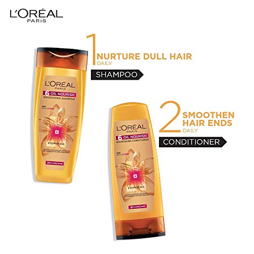 The 6 Oil Nourish Shampoo has been created to provide complete nourishment to your hair from root to tip with 6 Micro Oils making it soft shiny thick strong smooth and manageable.Science meets tradition with the infusion of 6 unique oils. The L'Oreal Paris 6 Oil Nourish Shampoo has been specially created by the L'Or al Research & Innovation Centre in India. It penetrates deep into the scalp giving it utmost nourishment and care that is suitable for all hair types.This shampoo comes with 6 Micro Oils to make your hair soft strong thick smooth shiny and manageable. Suitable for all hair types this shampoo penetrates into your scalp to make your hair beautiful.The 6 oil nourish shampoo has been created to provide complete nourishment to your hair from root to tip with 6 micro oils making it soft shiny thick strong smooth and manageable Science meets tradition with the infusion of 6 unique oils Massage gently into wet scalp/hair lather and rinse for soft nourished and healthy hair.