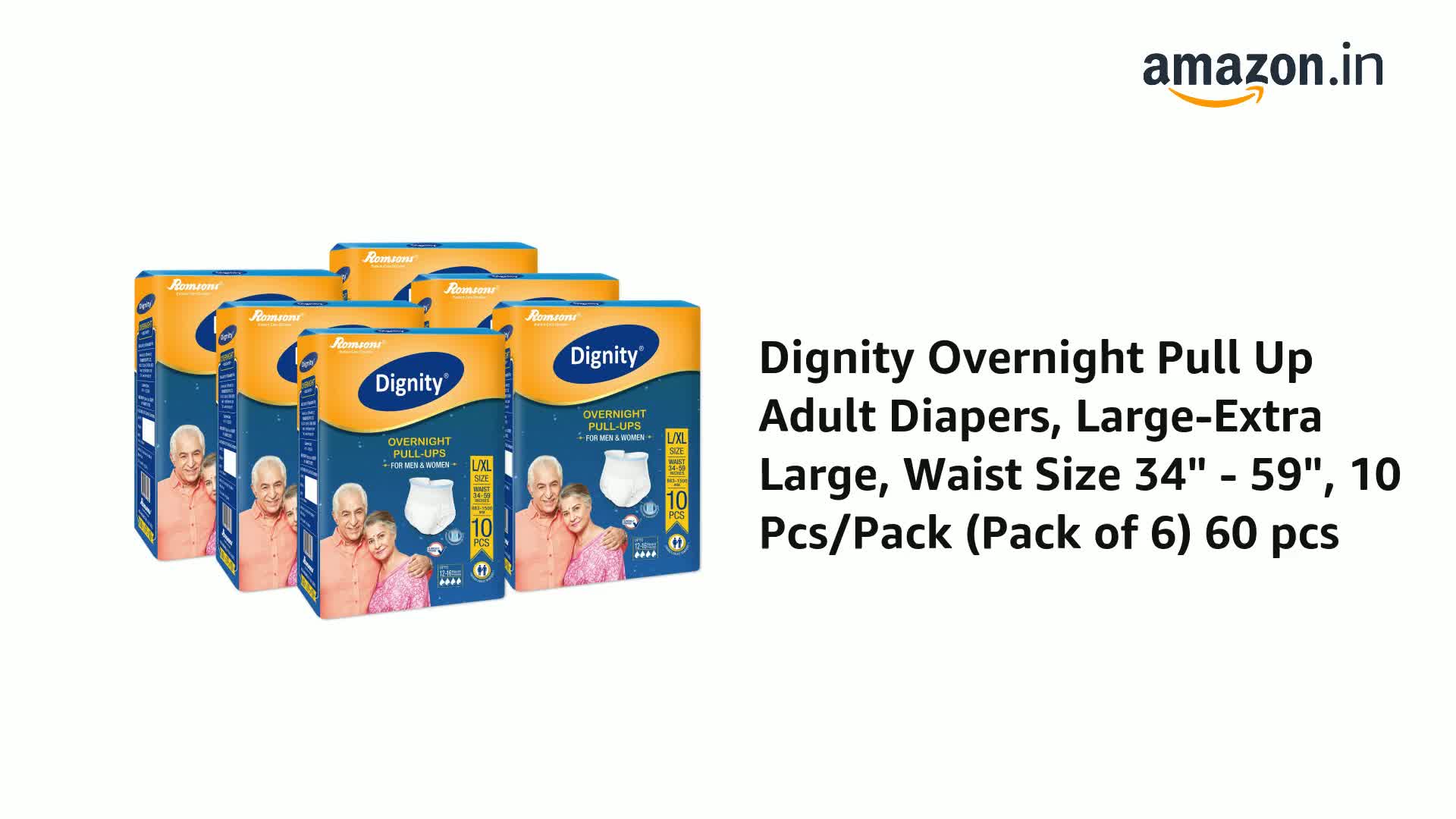 Dignity Overnight Pull Up Adult Diapers Pant Style - 60 Count (Large) with Soft Elastic and Extra Absorbent Core, Waist Size 34" - 59", 10 Pcs/Pack (Pack of 6)