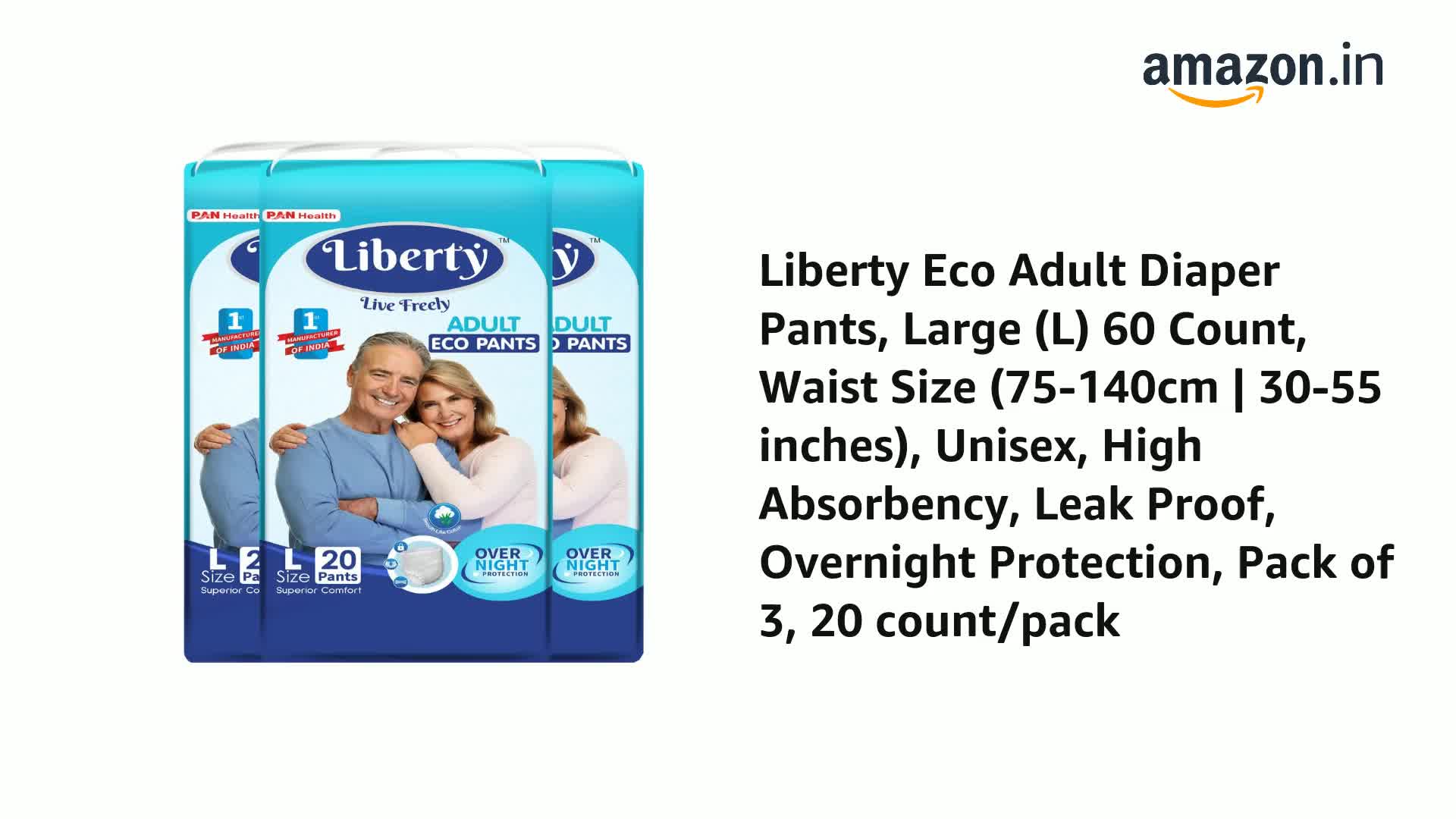 Liberty Eco Adult Diaper Pants, Large (L) 60 Count, Waist Size (75-140cm | 30-55 inches), Unisex, High Absorbency, Leak Proof, Overnight Protection, Pack of 3, 20 count/pack