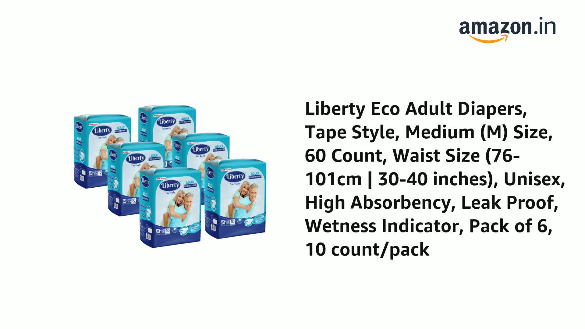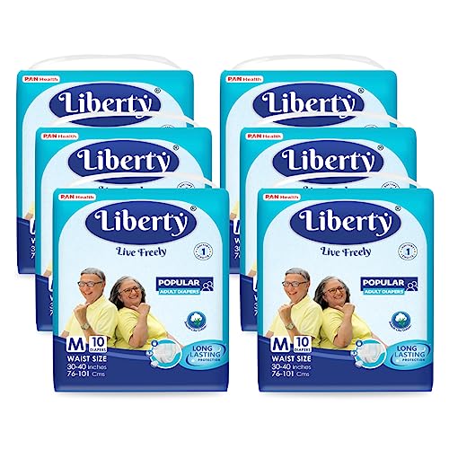 Liberty Popular Adult Diapers, Tape Style, Medium (M) Size, 60 Count, Waist Size (76-101cm | 30-40 inches), Unisex, High Absorbency, Leak Proof, Wetness Indicator, Pack of 6, 10 count/pack
