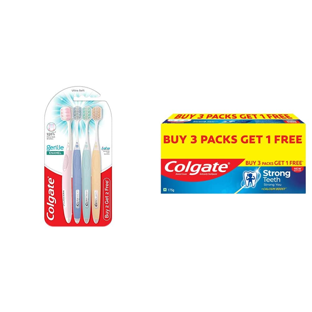 Colgate Gentle Enamel Ultra Soft Bristles Toothbrush 4 Pcs (Buy2 Get 2) Soft Bristles for Enamel CareToothbrushColgate Strong Teeth Cavity Protection Toothpaste Colgate Toothpaste with Calcium Boost 700gm Saver Pack India's No.1 ToothpasteDaant strong toh aap strong! Strong teeth chew better which leads to better absorption of nutrients making you stronger! Natural Calcium gets depleted while eating. Colgate Strong Teeth has a unique Calcium Boost formula which restores Calcium levels making your teeth 2x stronger. Colgate Strong Teeth toothpaste helps prevent cavities whitens teeth and freshens breath with regular use. This toothpaste is safe to use on kids and adults. Recommended Usage: Take pea size drop of toothpaste on a toothbrush and brush your teeth in circular motions or up and down for 2 mins twice a day. Can be used by Men women and children. Colgate is India's most trusted oral care brand. As a trusted partner we are committed to doing business with integrity and respect for all people and the world around you. Colgate offers quality oral care products including toothpastes toothbrushes and mouthwashes as well as expert dental health information. This toothpaste is 100% vegan and gluten-free. We care about our environment Colgate India is the nation's first to earn TRUE Zero Waste Platinum certification for all its four manufacturing sites in India from Green Business Certification Inc. (GBCI). This toothpaste is made in India with the highest quality standards.