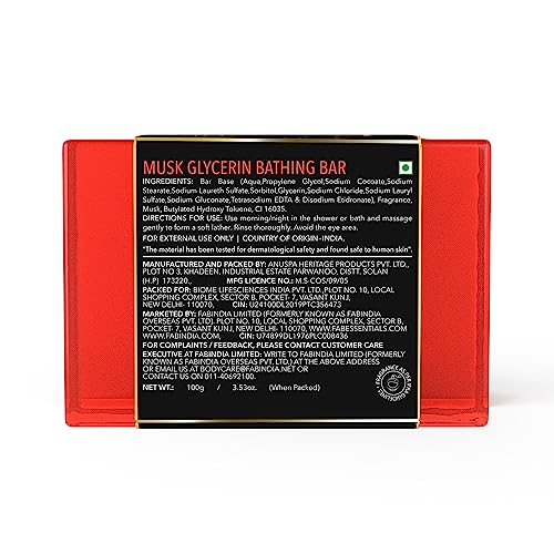 fabessentials Musk Glycerin Bathing Bar is enriched with the goodness of Mint and Glycerin. Free from toxins this gently cleanses away dirt and grime from your body while retaining skin's natural moisture balance. Musk has an alluring aroma that makes bath a spa like-experience while Glycerin hydrates and moisturises skin and banishes dryness and roughness.