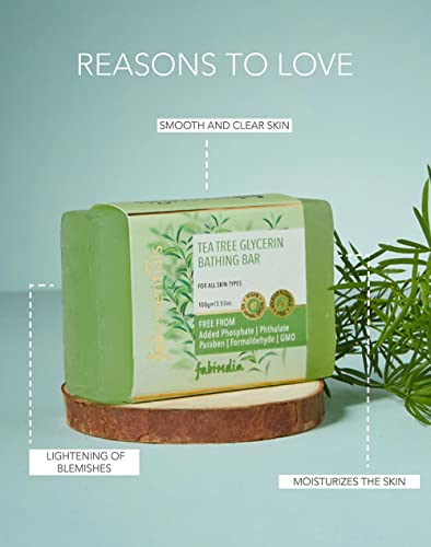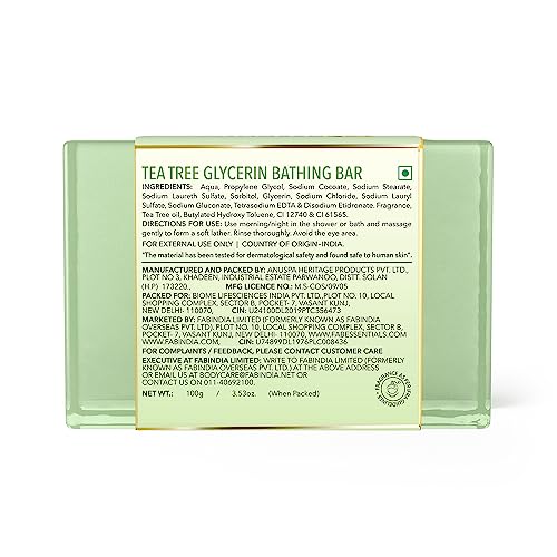fabessentials Tea Tree Glycerin Bathing Bar is enriched with the goodness of Tea Tree and Glycerin. Free from toxins this gently cleanses away dirt and grime from your body while retaining skin's natural moisture balance. Tea Tree helps fight and prevent skin breakouts while Glycerin hydrates and moisturises skin and banishes dryness and roughness.