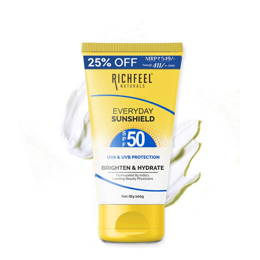 Protect your skin from harmful UV rays with RichFeel Naturals Everyday SunShield SPF 50. This lightweight non-greasy sunscreen provides broad-spectrum UVA & UVB protection keeping your skin safe from sun damage tanning and premature aging. Infused with natural ingredients it hydrates and nourishes while offering long-lasting sun defense.