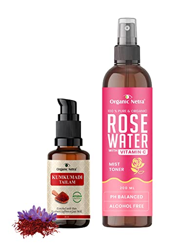 Organic Netra Rose Water Toner with Vitamin C is made from rose petwith no ed extra fragrances. It is a hydrating formula that helps restore moisture making the skin look fresh. Rose water helps to get the dirt out of the pores and helps maintain the skin's pH balance. This body toner has an active cleansing agent that penetrates deep into pores to cleanse them locking in hydration to increase elasticity. Vitamin C is loaded with antiwhich help to make your skin radiant and youthful. | Meticulously crafted using the time-honoured Kshir Pak Vidhi Kumkumadi Tailam blends premium Kashmiri Saffron 29 herbs and pure . Essential nutrients in the oil help nourish and strengthen your skin's natural barrier to protect against external stimuli. Kumkumadi face oil for glowing skin is the best beauty ritual to revive your petal-soft radiance soften the appearance of fine lines lighten spots lessen pigmentation and prevent over-stripg