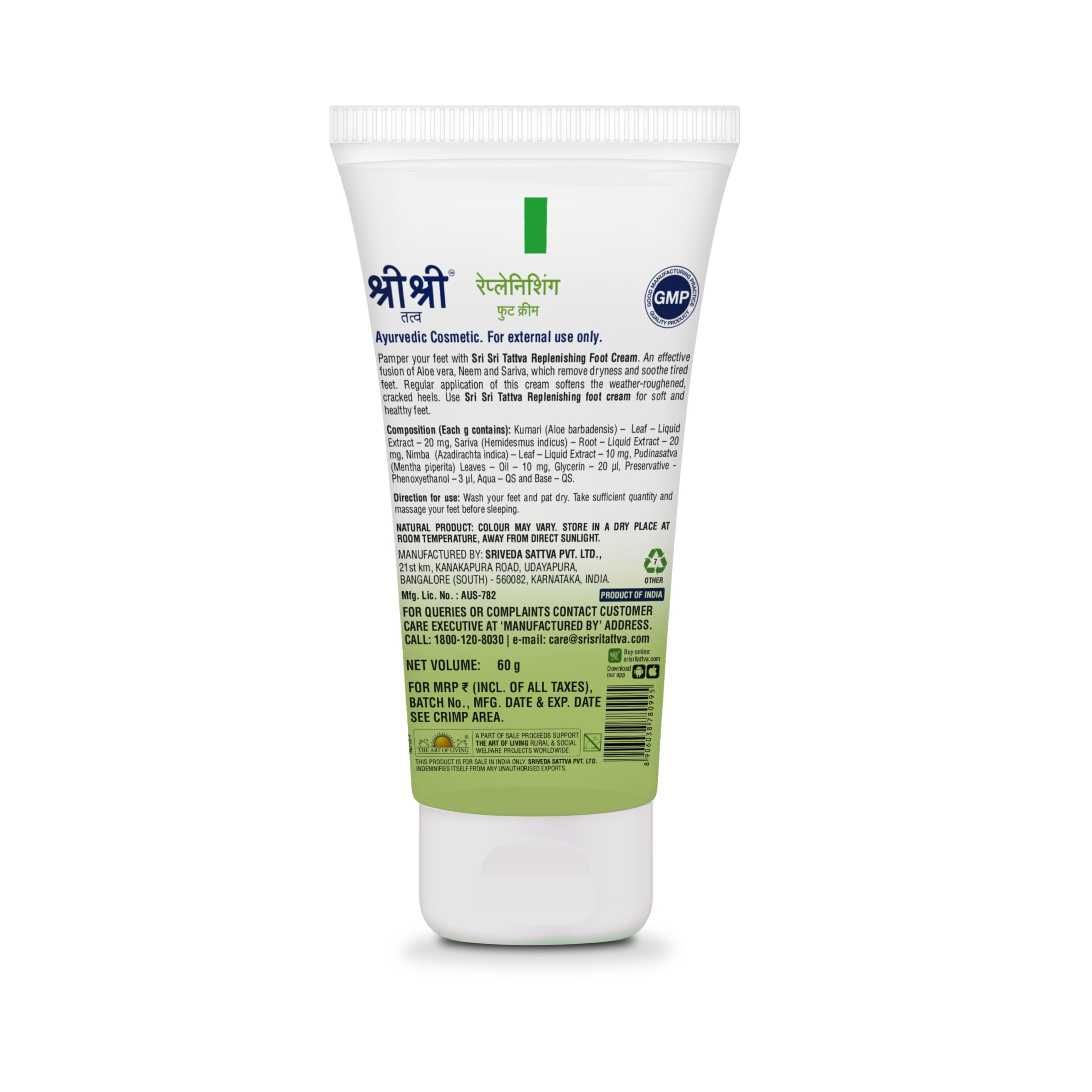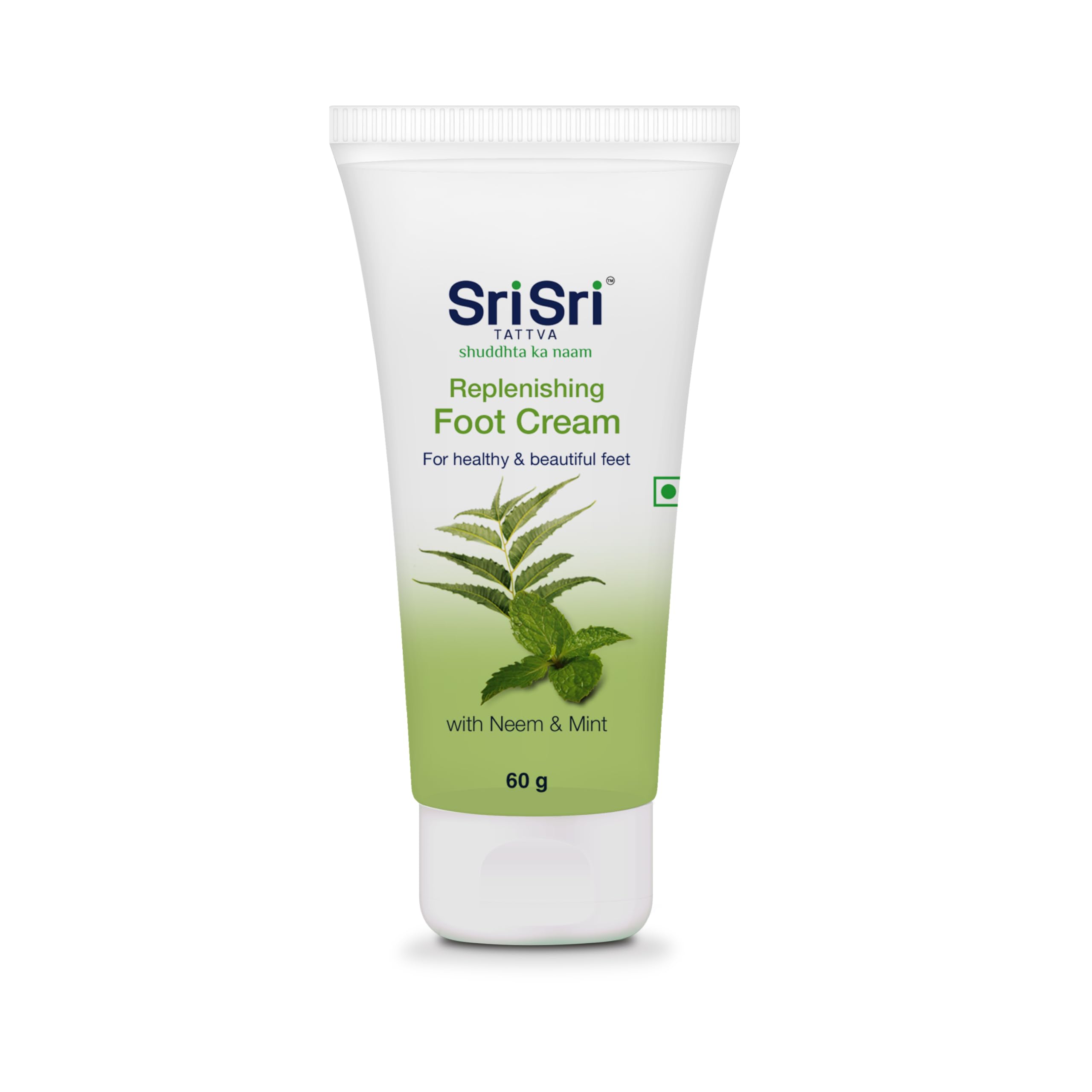 Pamper your feet with Sri Sri Tattva Replenishing Foot Cream. An effective fusion of Aloe vera Neem and Sariva which remove dryness and soothe tired feet. Regular application of this cream softens the weather-roughened cracked heels. Use Sri Sri Tattva Replenishing foot cream for soft and healthy feet. Key Benefits Improves toe nail health. Removes dead skin cells. Prevents corns blisters and toenail ingrowth. How to Use Wash your feet and pat dry. Take sufficient quantity and massage your feet before sleeping. Store in a dry place at room temperature. Away from direct Sunlight. Key Ingredients Neem Mint