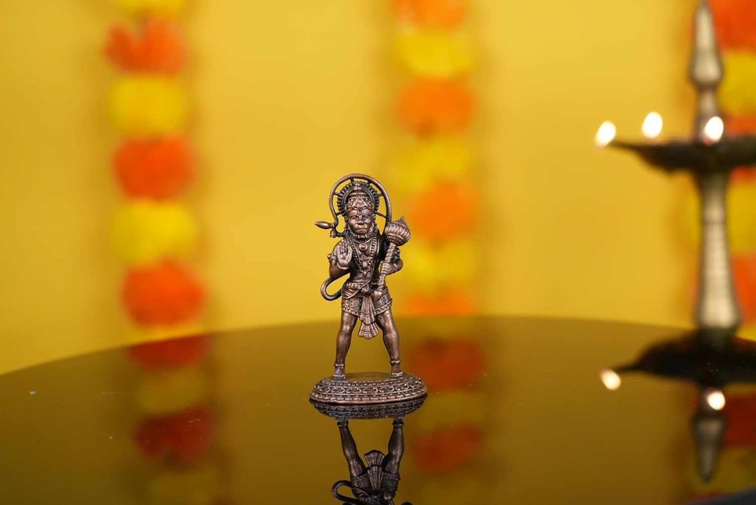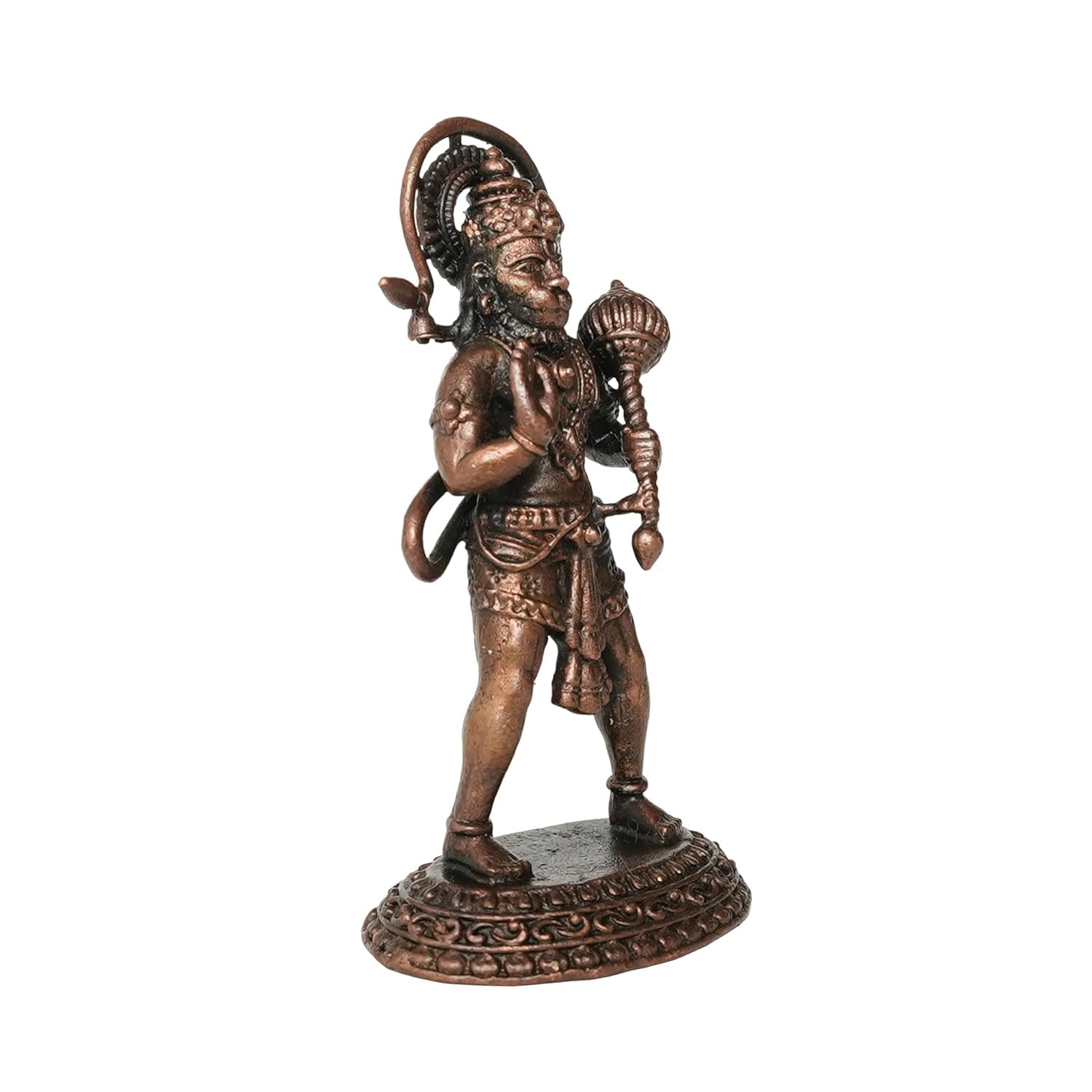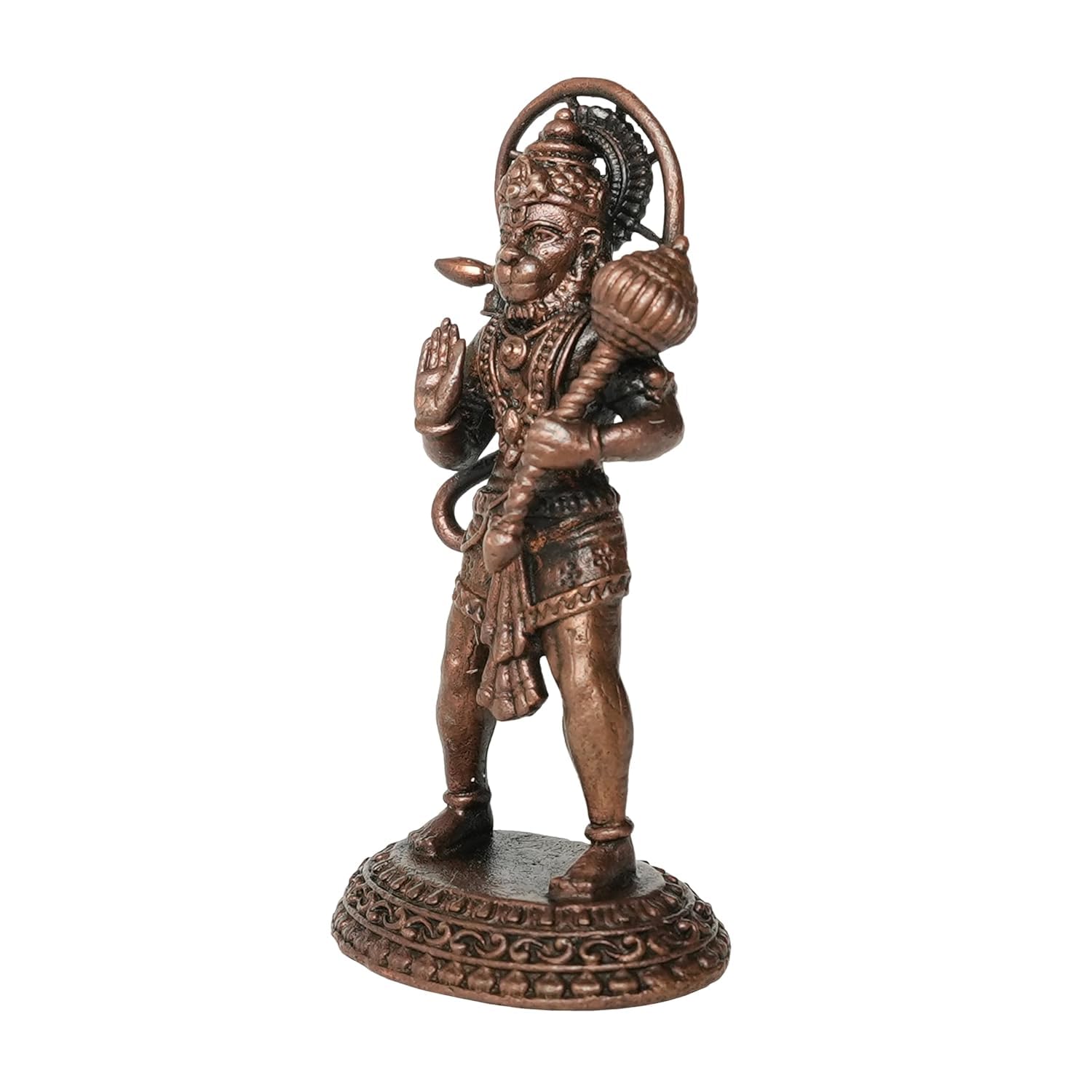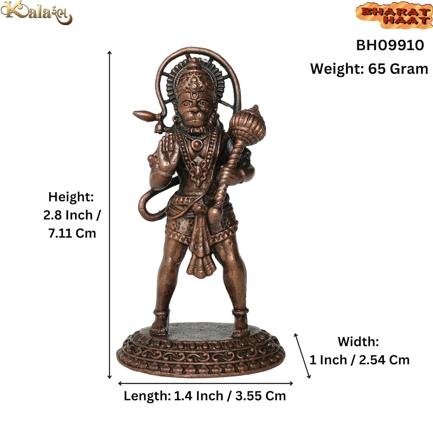 Copper Standing Hanuman Pooja Room Home Decor Collectible Handicraft Made from Copper Each of these products are made of Copper with carefully designed products suits for every possible place that this art can fit This Statue is durable and long-lasting Gifting Each of our products are suitable for gifting purpose. This brass decoration item enhances the decoration and gives safe and silence vibe in the home. This is perfect for home office use. A valuable personal and professional collection Measuring 3.55 Ã 2.54 Ã 7.11 (L Ã W Ã H) Cm and Weighting 65 Gram. This statue is substantial and impactful. Clean by Dry Cloth and Use Pitambari Powder Specially for Brass Material