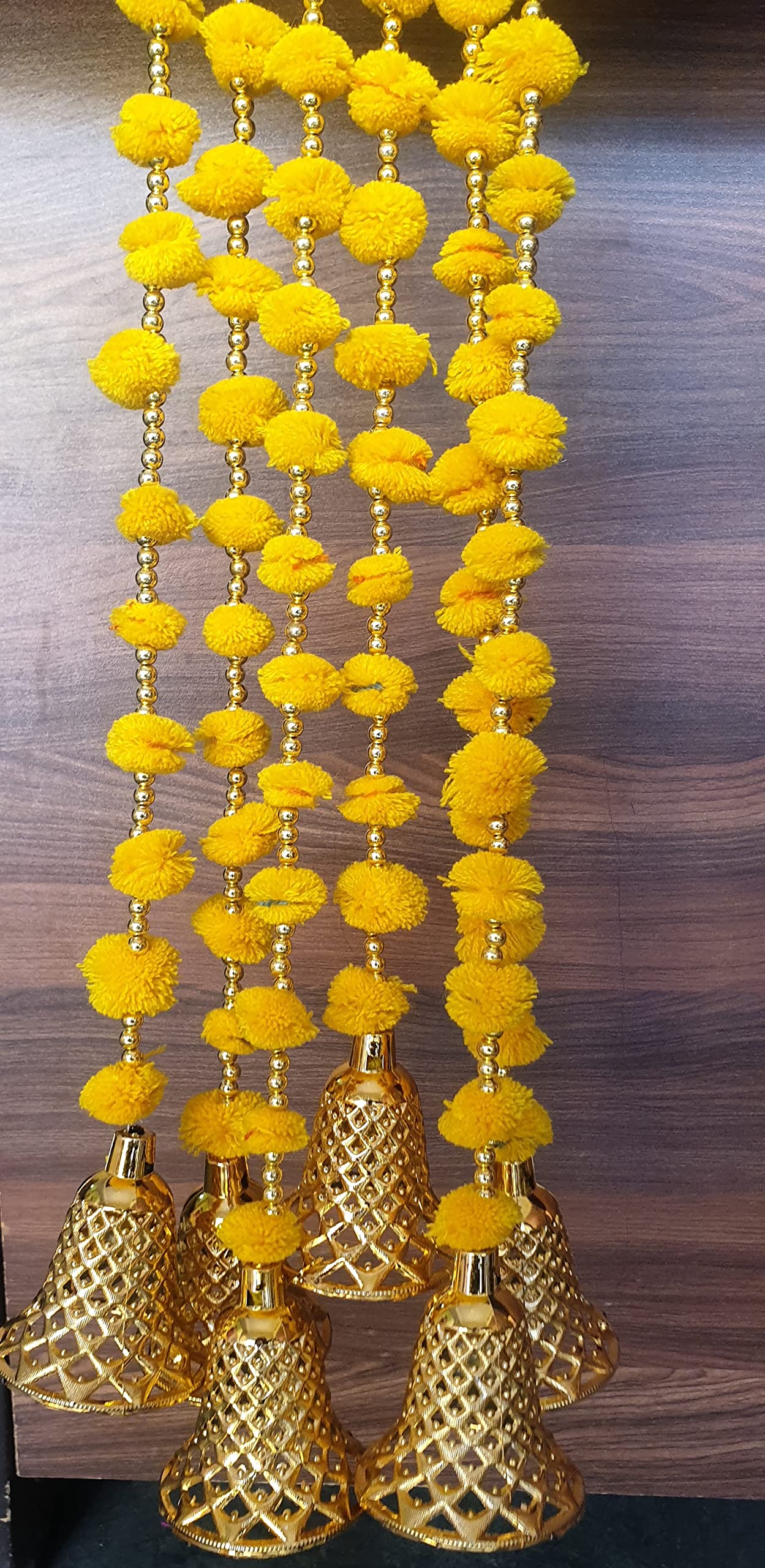 Pom-poms beads & golden hanging bells strings/garlands/torans/wall hangings for decoration ( Approx 4.5 FT and 54 inches ) Made in India. Beautiful wall hanging Toran for home decoration. It can be used to decorate pooja room home entrance door can be hung like toran in any design. It can be used for decoration of hall living room or drawing room balcony or garden also. A beautiful home decor for any function pooja marriage ceremony engagement or festivals such as diwali dusshera Ganesh Chaturthi etc. The wall hanging torans are long lasting and can be easily washed and reused. You can hang it anywhere on your doorway main door railings on the sides of mirror etc. It adds the touch of Tradition to the interiors of your house. Length of the strings is 4.5 FT / 54 inches length 4 Strings