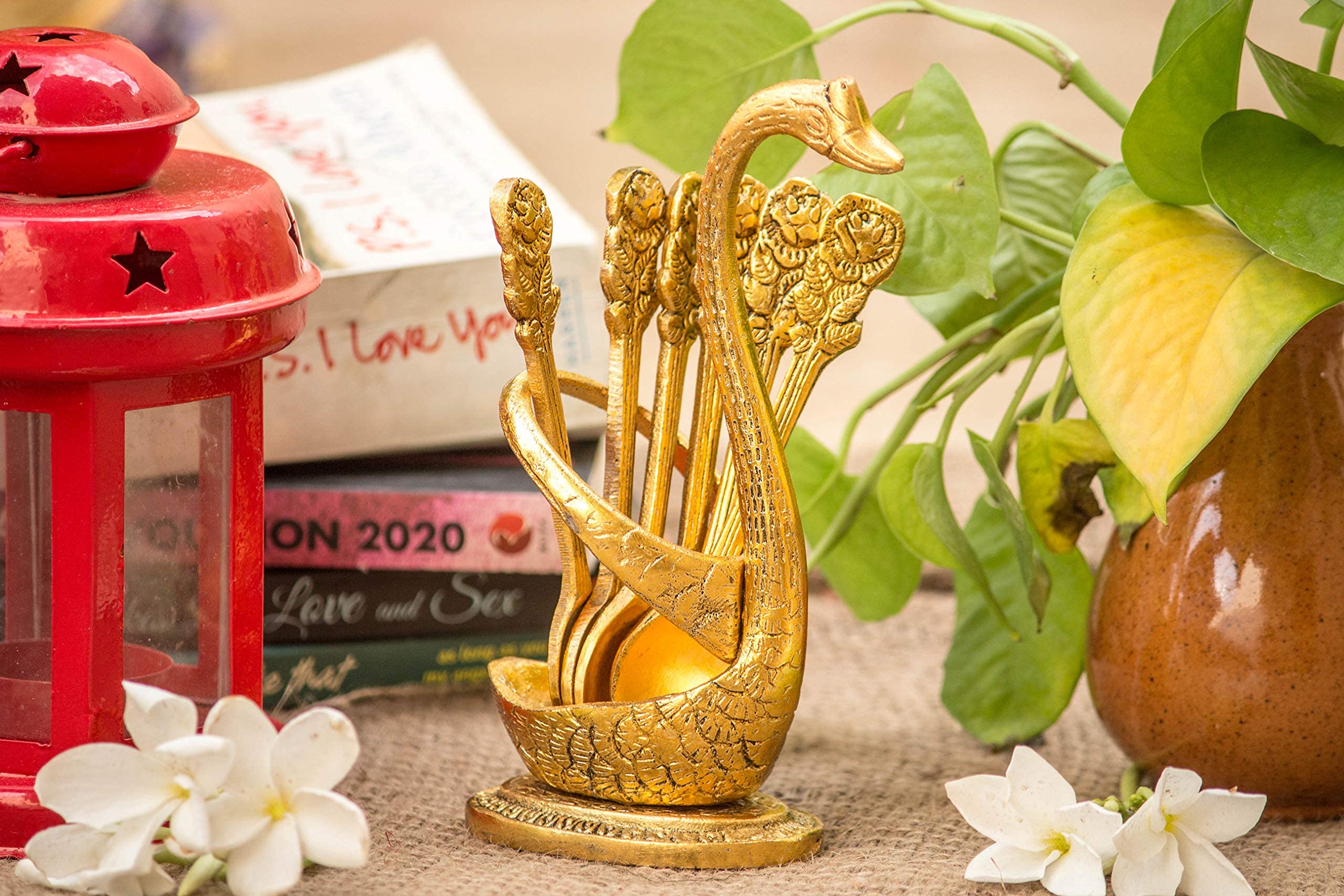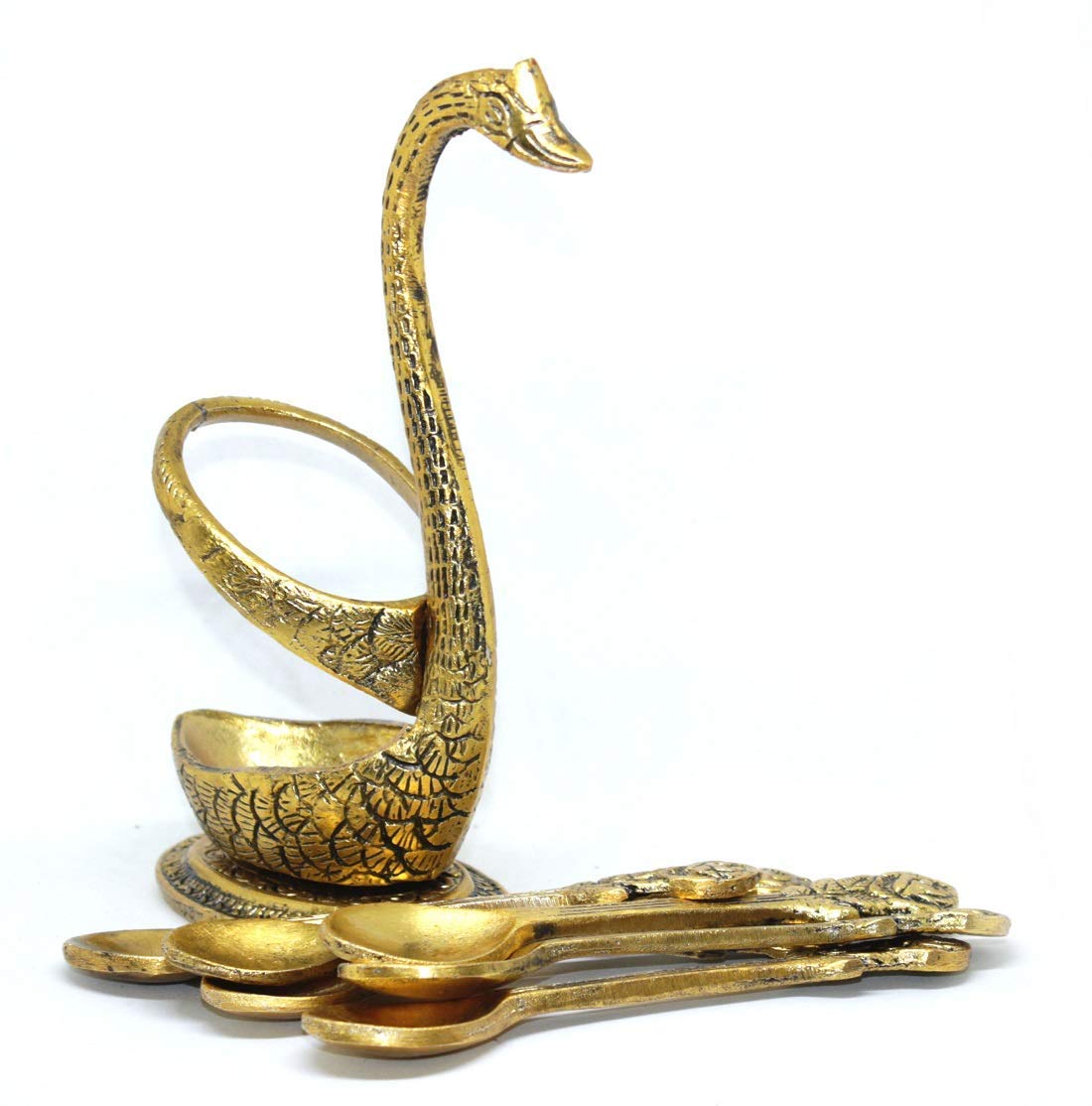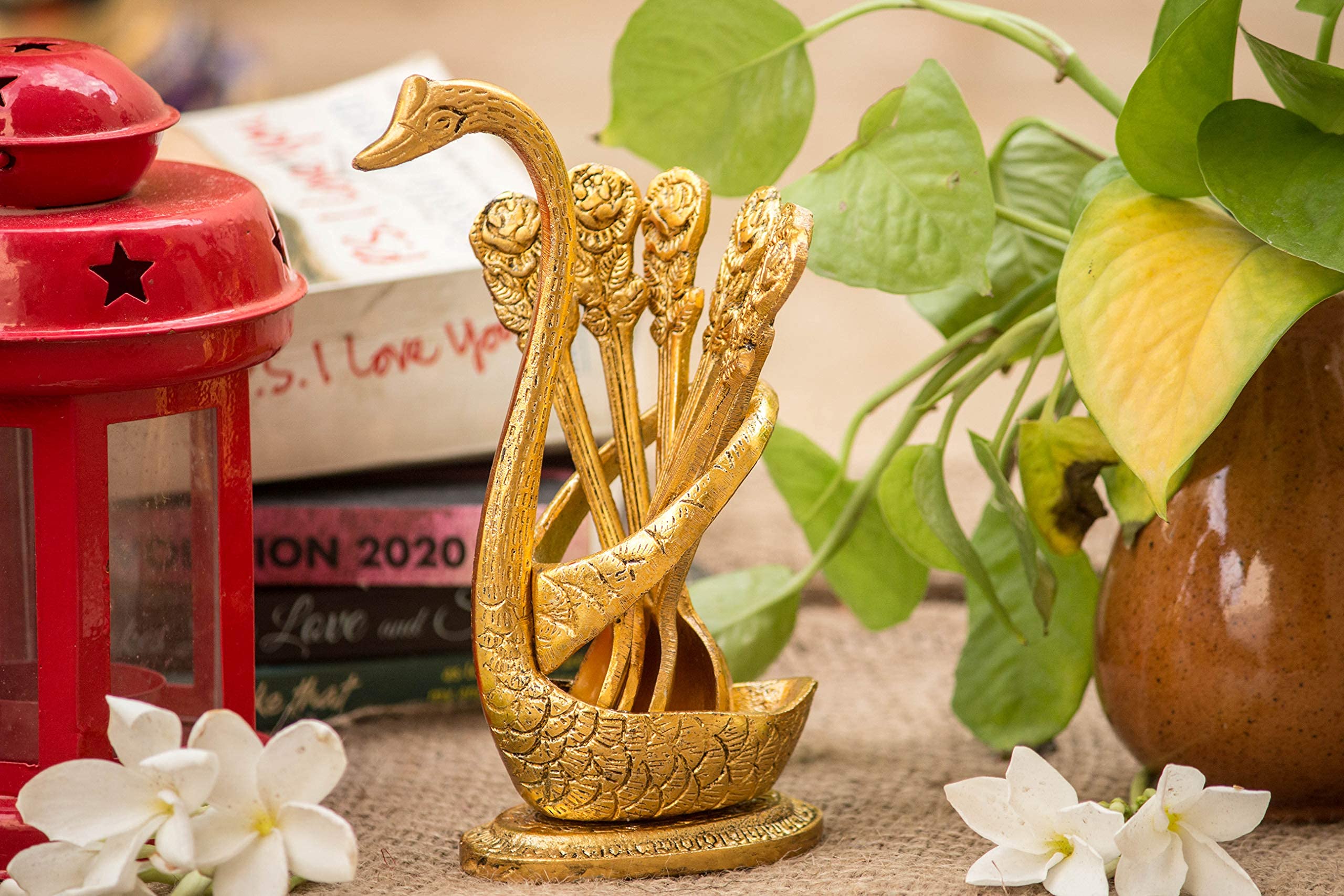 Package Contains :- 1 statue of Swan Spoon Stand On Base and 6 Dessert Spoons Product Dimension in CM (L B H) :- 8 X 5 X 15 Base Height - 2 cm Material - Metal (Oxidised) Color - Golden Serve refreshments salted snacks or desserts with this antique spoons and surprise your guests It Is A Complete Finished Product And Comes With A Classy Swan Shaped Stand That Holds All The Spoons Perfectly. The swan with the long neck is designed beautifully and the spoons can be used for eating It does not break crack stick or melt even after years of heavy use. It is not react to food. Long term valuable product.