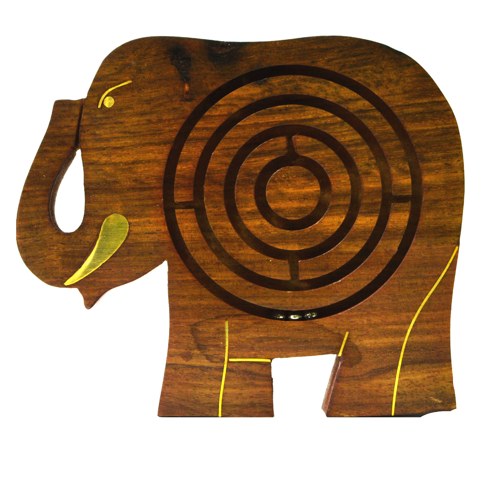 This lovely shesham wood labyrinth puzzle has been carved within the shape of an elephant. The brass inlay adds an appealing dimension to this toy. This toy helps to increase the concentration span, to an 'aha' moment and it makes for a special gift. Originally developed by Charles Martin Crandall in 1889 as Pigs in Clover, it was adapted the world over. The toy has a smooth finish and is made according to a child's hand. To win the game, all the steel balls have to be guided patiently into the centre, this requires eyehand coordination and problem solving skills. It is a challenging game for anyone and for any time as it is travel friendly and requires no cells/batteries. This handicraft has been created in Uttar Pradesh, India.
