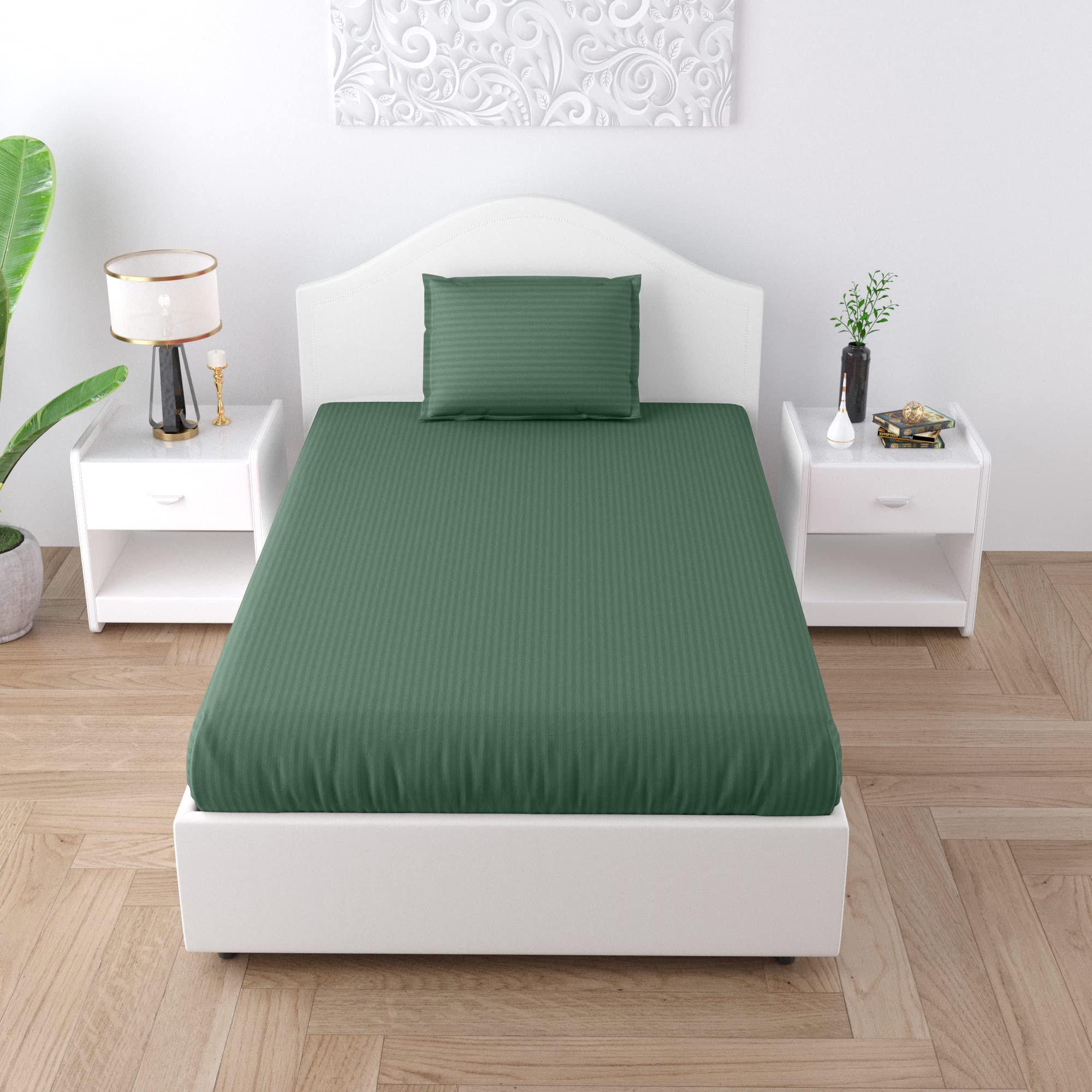 RAJASTHANI PUPPETS Forest Green Satin Stripes Single BedSheet with Pillow Cover