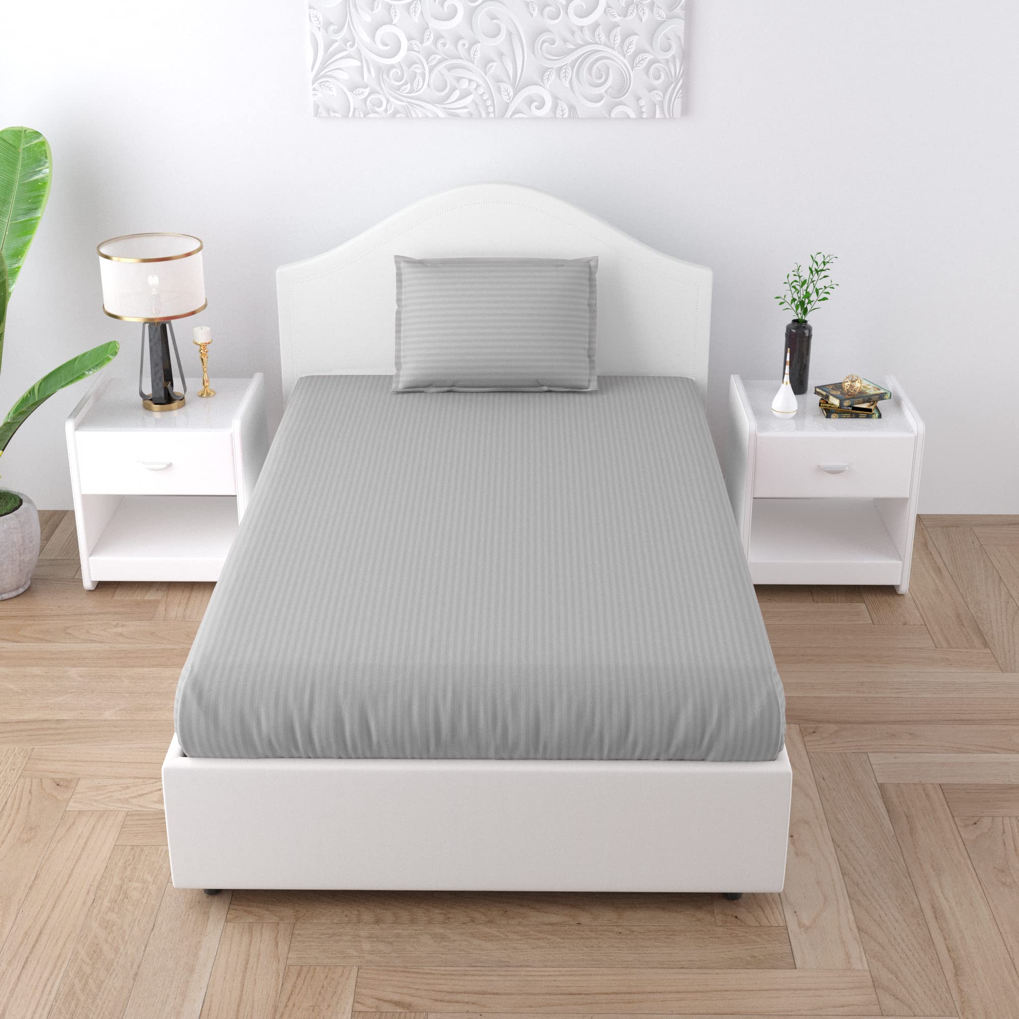 RAJASTHANI PUPPETS Silver Grey Satin Stripes Single BedSheet with Pillow Cover