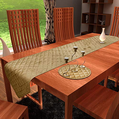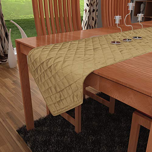 The table runner are made with polyester duiponi fabric on both side with cotton layer inside and intricate quilting for rich look by HOME BRANDS.