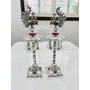 German Silver Brass Plated Peacock Samai Diya Diwali Gifts Metal Diya Handmade Indian Pooja Oil Lamp Silver Diya Lamp Akandh 5 Wick Diya Home Decor It is made from German Alloy Metal (Composition of Copper Zinc Nickel); which is finished with silver plating and "oxidized work" on its surface which gives it a "antique look". It has hand made work with beautifully hand crafting on German Alloy Metal. It is made by Metal carving work Rural India artisans who made it an accurate durable and washable product. Light up your home with this beautiful Ganesha Diya. Crafted from a quality German Silver Ganesha Figurine oil lamps add charm to the beauty. People light up these wick lamps for performing aarti of Gods they worship. These are also used as Diwali lights. Made in brass this is a solid piece of collectible figurine sculpture that you would be happy to keep at your home. Gift your loved ones this attractive Diya for special occasions. The premium bell has beautiful sound and is an essential for temple at home. This product is crafted from brass that is considered to be a sacred metal and traditionally used in prayer accessories. The sweet sound of this bell will fill the atmosphere with divine sound during any pooja / ceremony. German Silver Ganesha Samai Diya Diwali Gifts Metal Diya Handmade Indian Pooja Oil Lamp Silver Diya Lamp Akandh 5 Wick Diya Home Decor Illuminate your home with the enchanting beauty of our German Silver Hand-Engraved Peacock Samai/Diya with Bells. This exquisite piece combines traditional craftsmanship with elegant design creating a mesmerizing addition to your festive decorations or everyday ambiance. Crafted with meticulous attention to detail our samai/diya showcases the artistry of skilled artisans. Made from premium German silver it boasts a radiant shine and durability that will withstand the test of time. The intricate hand engravings on the surface depict a graceful peacock motif symbolizing beauty prosperity