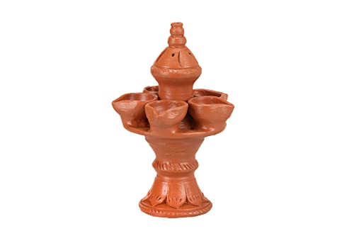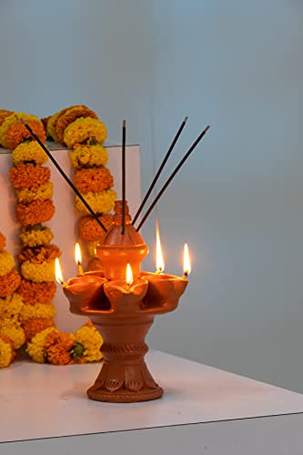 Karru Krafft Wheel Thrown Terracotta Stand Panch Diya with Incense Stick Holder for Pooja Decor Navaratri Decor Diwali Lighting Diwali Gifting Home Decor