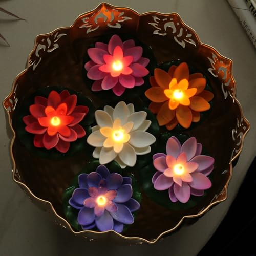• The Package Contains:- 6 Pieces Lotus Floating LED Light Candle - Battery Operated Size : 9 cm Color : Multi