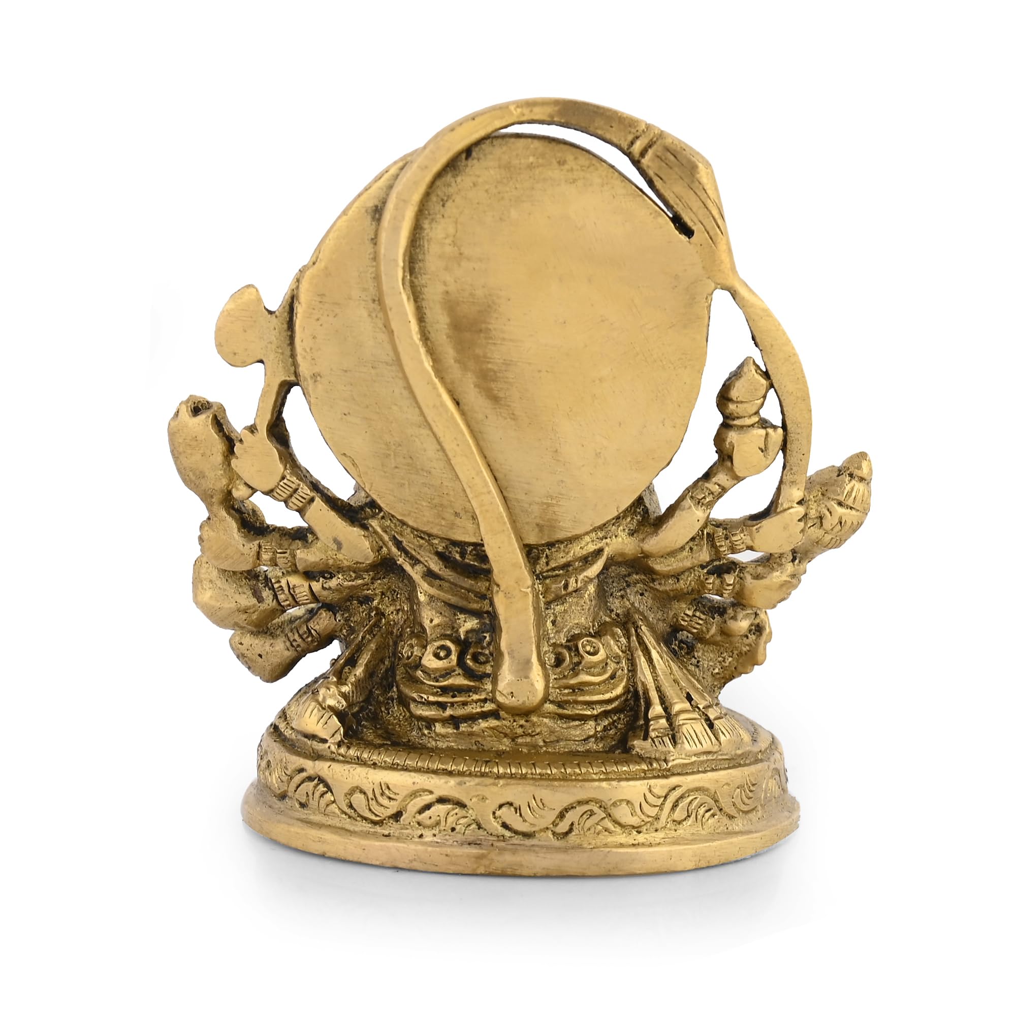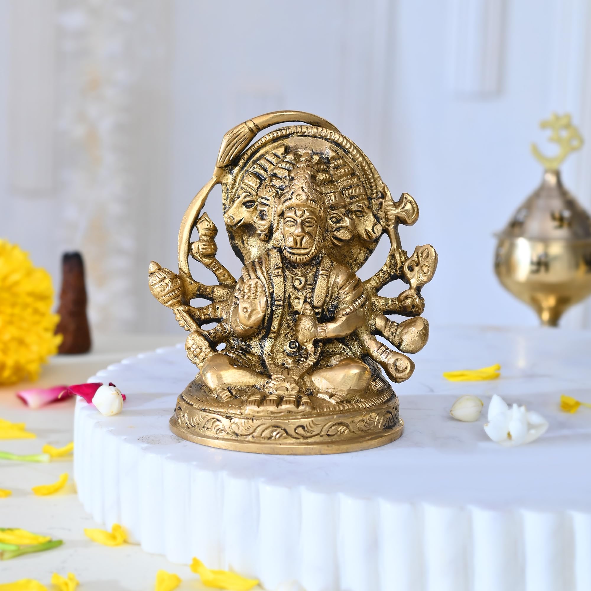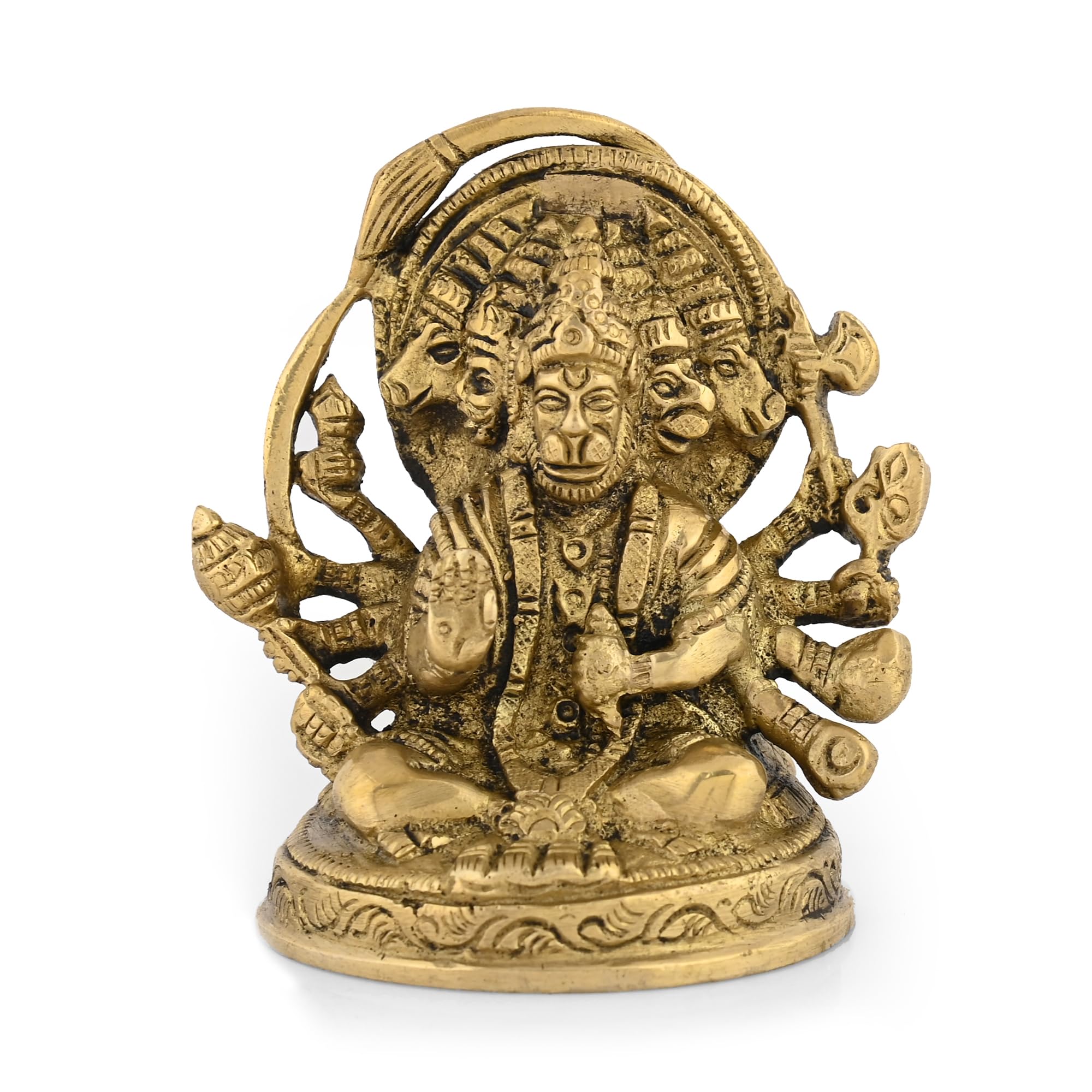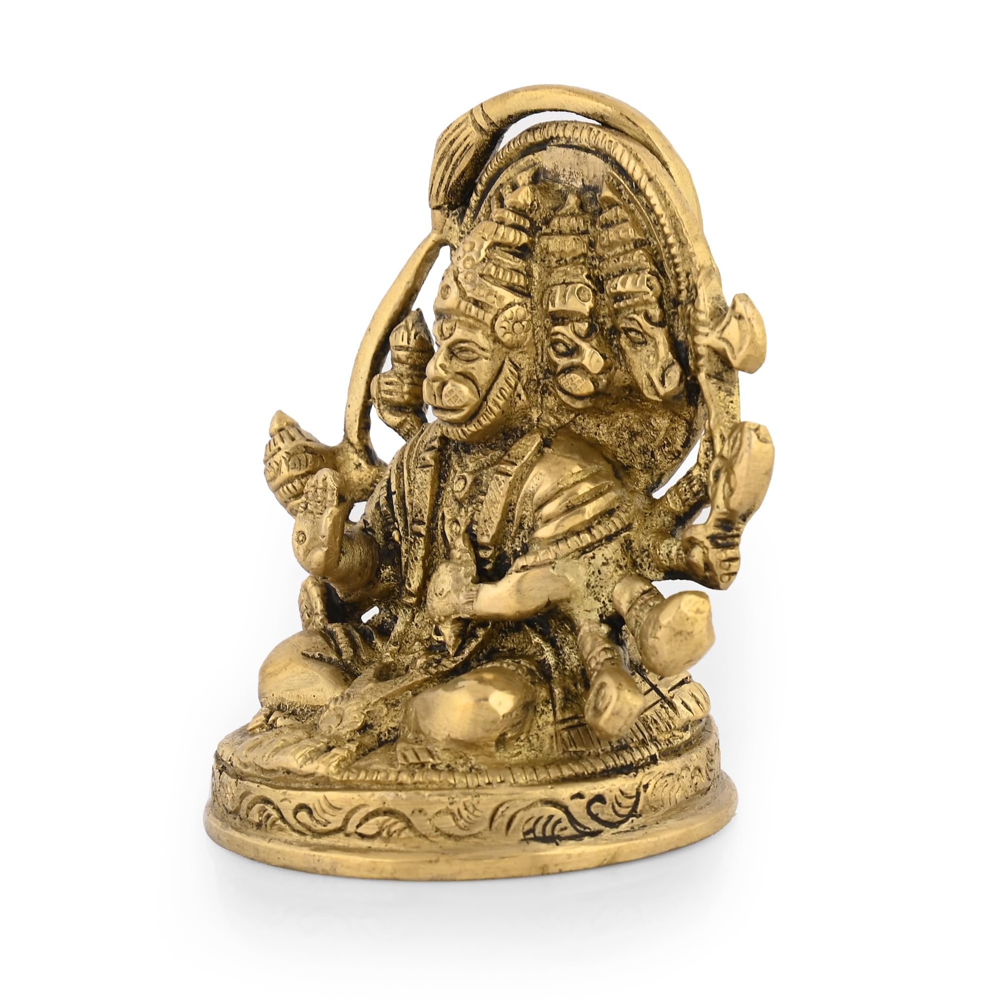 Immerse yourself in the divine presence of Hanuman with this exquisite brass murti. Crafted with meticulous attention to detail this Panchmukhi Hanuman idol portrays the five-headed manifestation of the revered deity symbolising his unwavering devotion courage and strength. Handcrafted by skilled artisans this brass figurine radiates an aura of spirituality and reverence. Adorned with intricate engravings and intricate designs it captures the essence of tradition. Whether placed in your home office or place of worship this Panchmukhi Hanuman murti will serve as a constant reminder of the virtues of loyalty selflessness and unwavering faith. Measuring approximately 9 cm in height this brass idol is a timeless addition to your sacred space evoking a sense of serenity and divine blessings. Embrace the spiritual energy and bring the blessings of Hanuman into your life with this stunning brass murti.