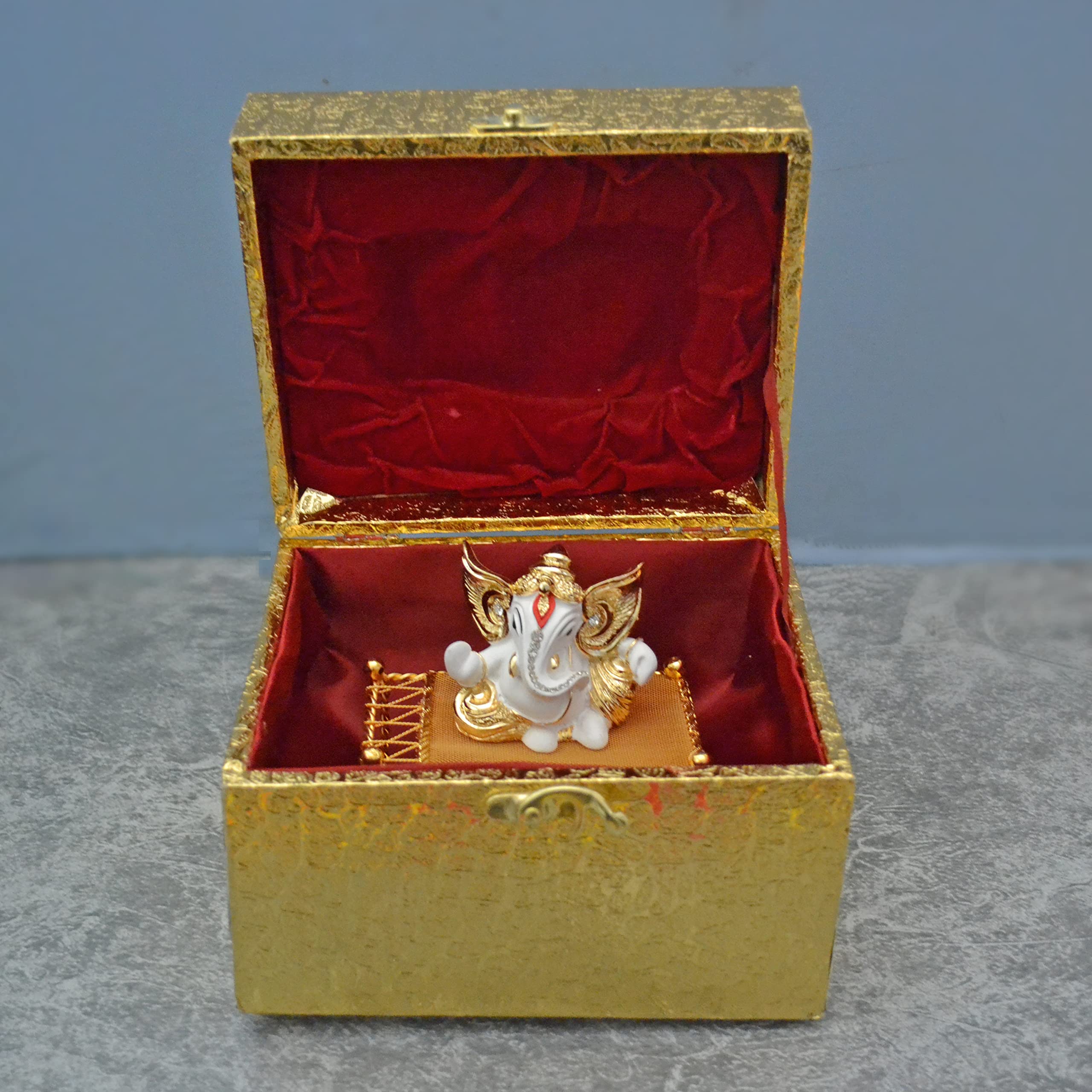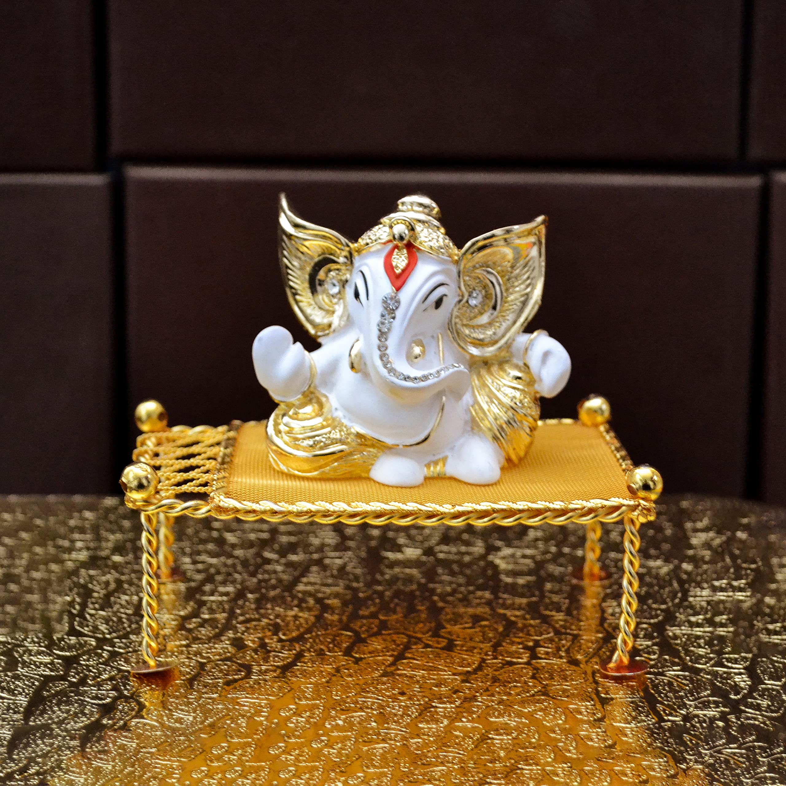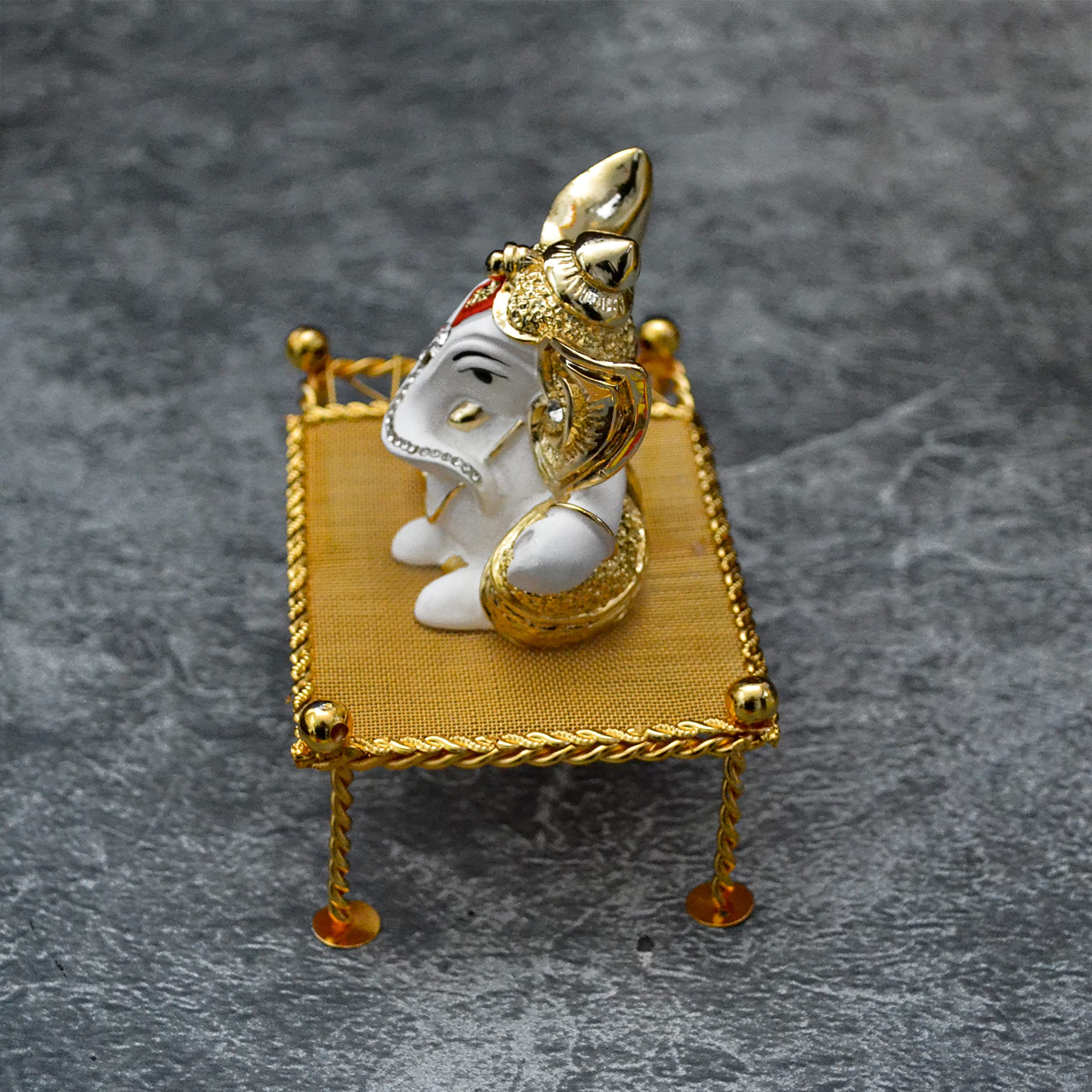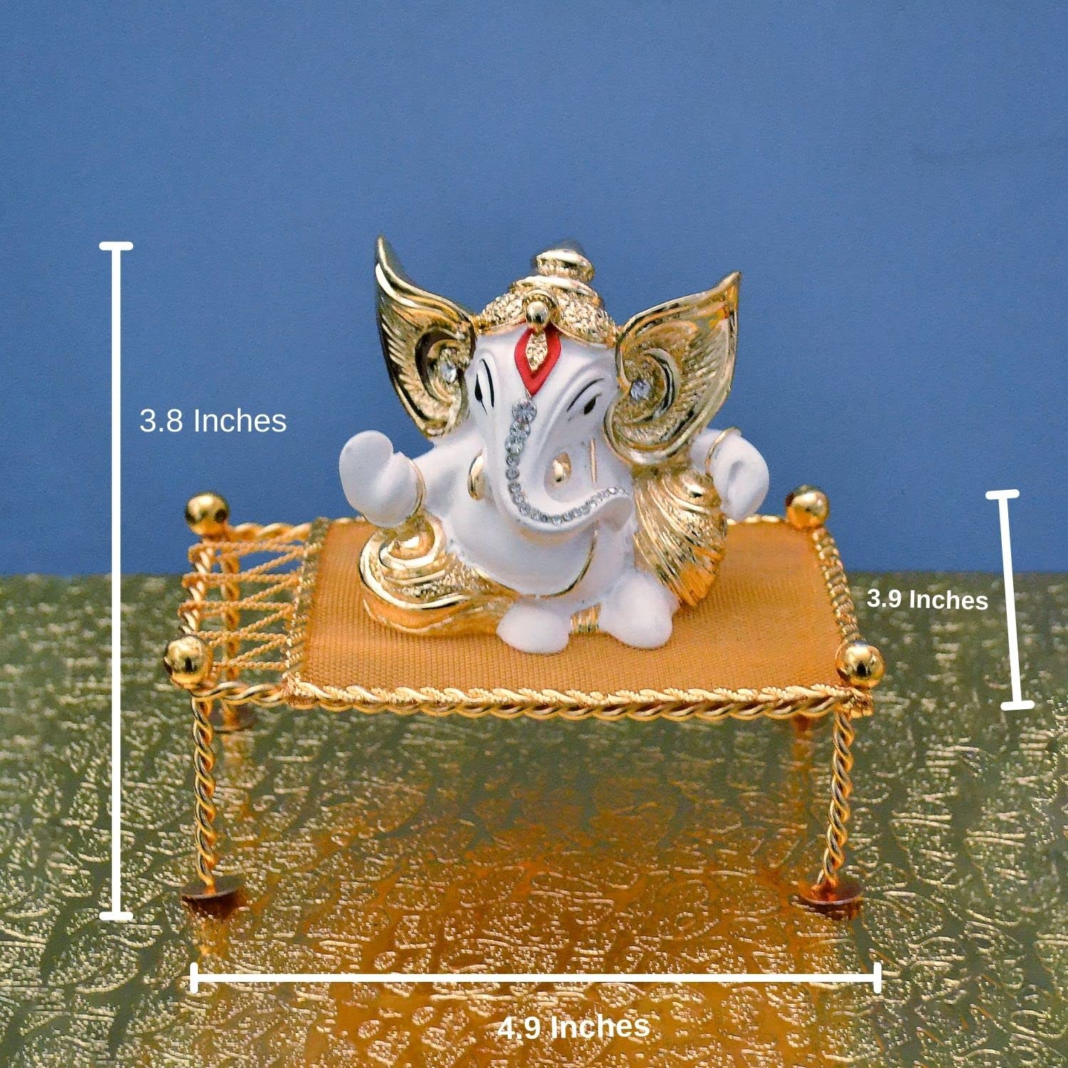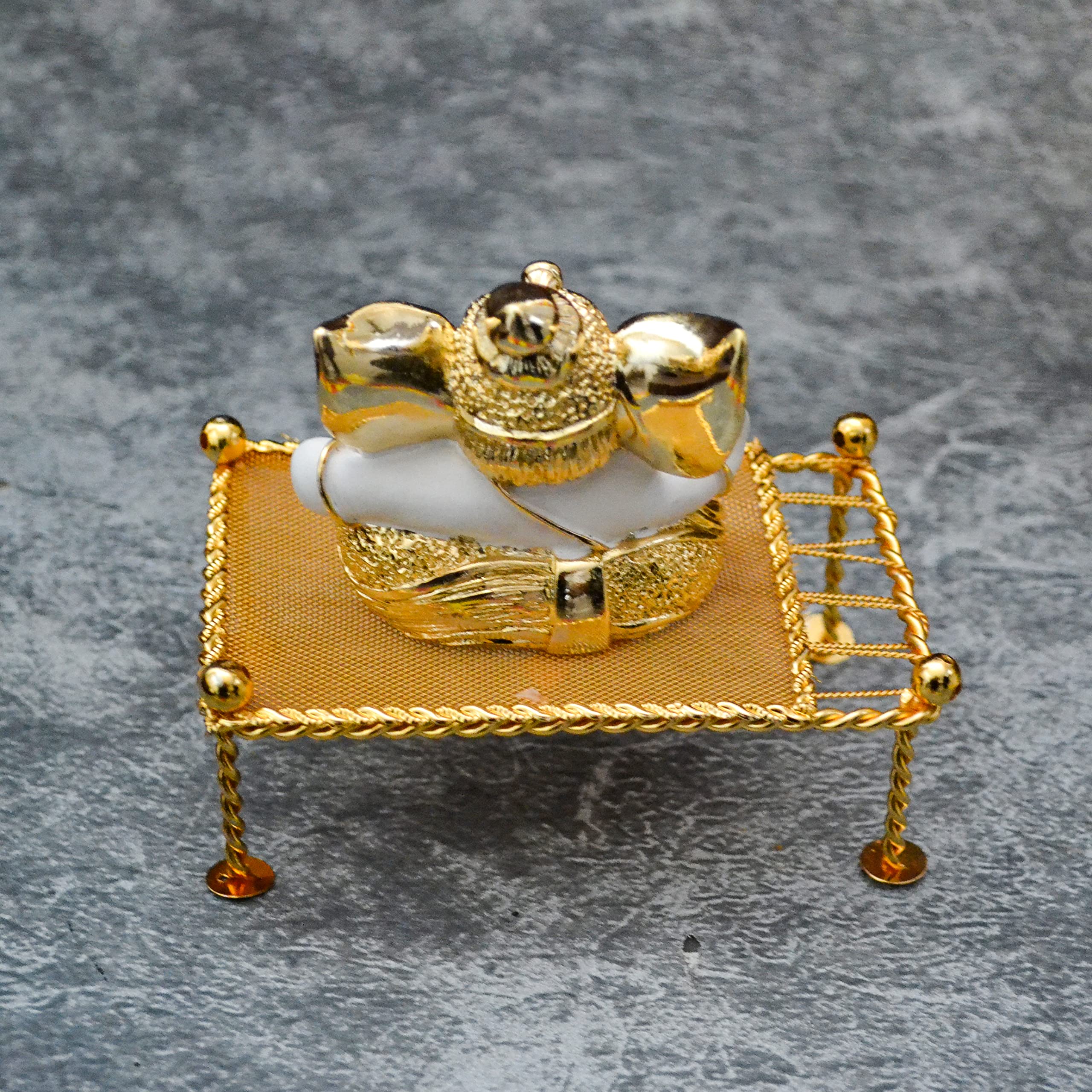 Gold Plated Ganesh Idol Sitting on Charpai (Cot) with Gifting Box for Home Office Gift Item Golden