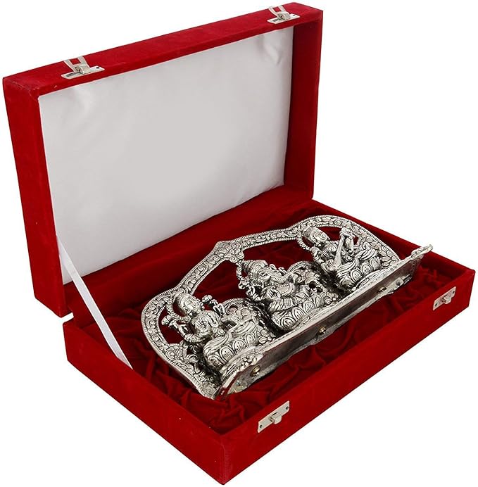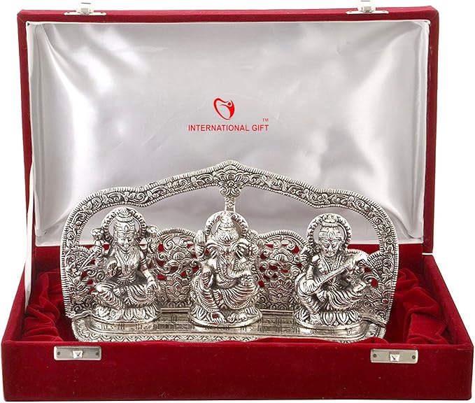 INTERNATIONAL GIFT Gold Laxmi Ganesh Sarswati God Idol Statue Oxidized Finish with Luxury Velvet Box Packing and Beautiful Carry Bag (Showpiece)
