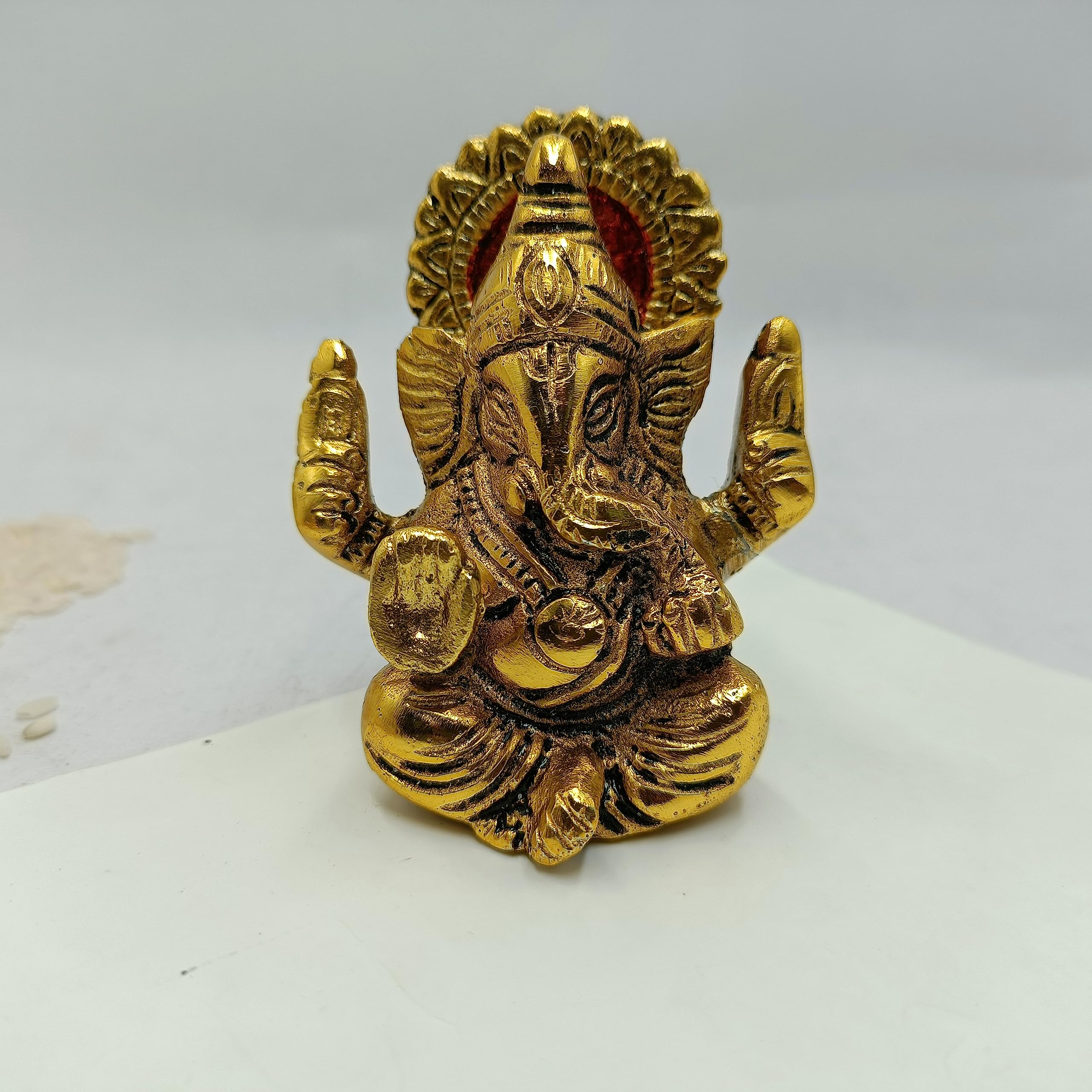 Metal Ganesha is the symbol of all good beginnings. He is associated with success and overcoming obstacles. He also brings happiness in our lives. This artifact by us brings to you ganesha in his most charming and endearing figures. this figurine is made of high quality metal and enamelled with golden finish to bring life to your home. This figure is brilliant example of art and the hard work done by the craftsmen is simply visible. Dimesions :- 2.2 Inch (L) x 1.4 Inch (W) x 2.8 Inch (H) | Weight : 90g | Material : Metal