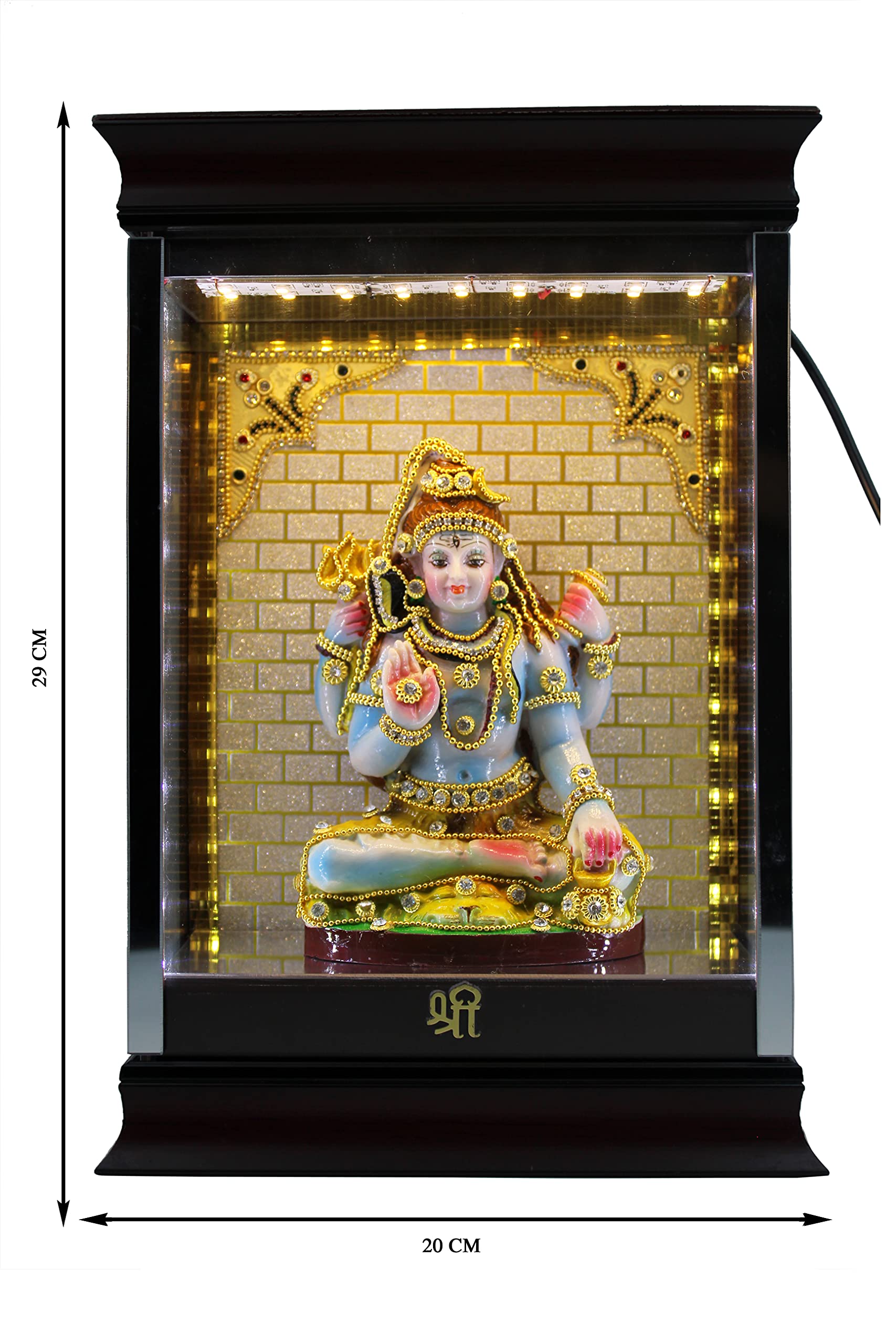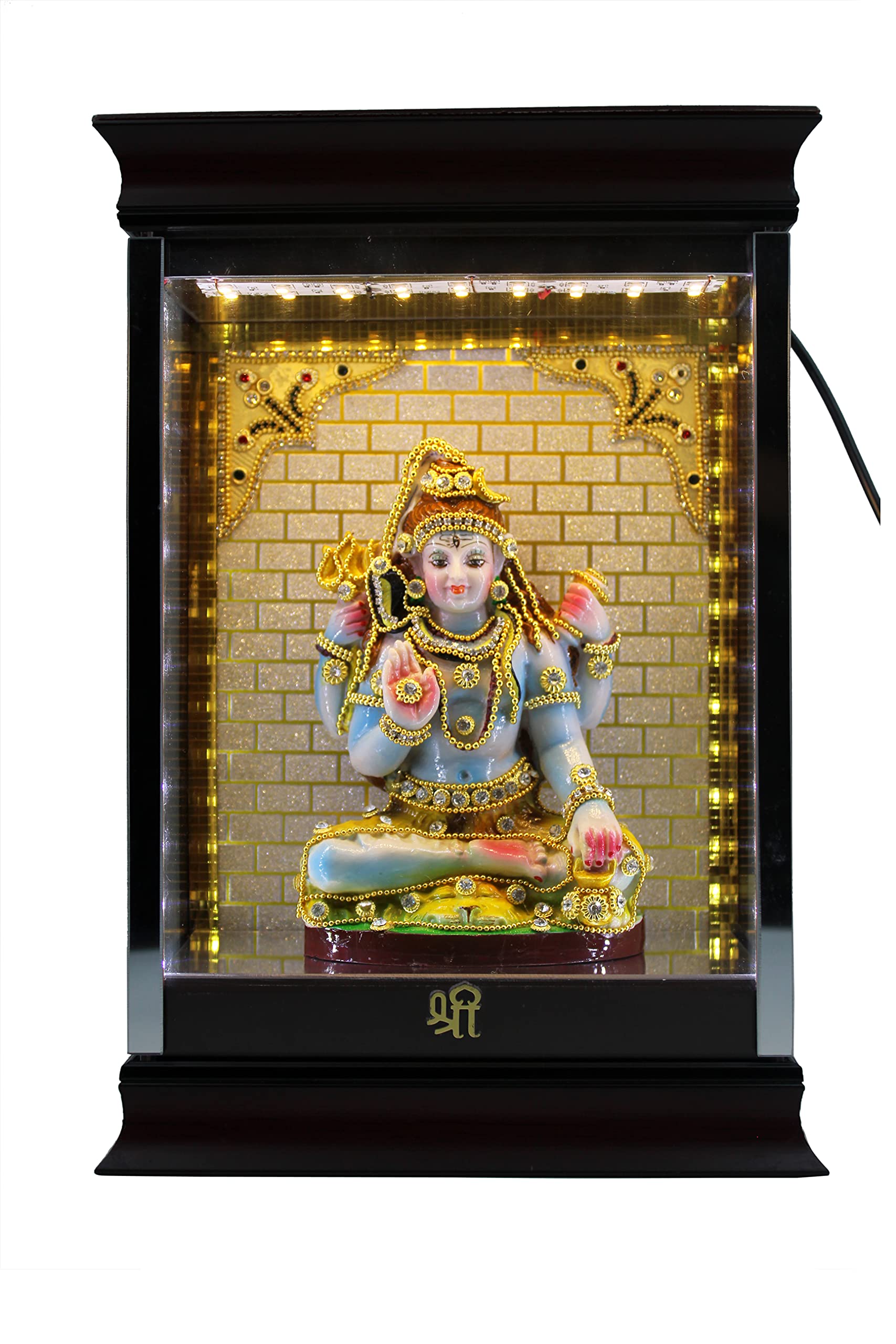 STONE WORK Presented Two In One Product One Is A Beauiful Sculpture And Second One Is A Desiner Acrylic Cabinet With Beautiful Background Graffic With Golden And White luminescent LED lights with external power supply for easy repair and replacement With 12V AC Dietachable Adaptor.This Cabinet Base material is high density water resistant sturdy boards and its unlike partical boards giving extra strength and durability above all longivityImported Acrylic Cabinet BoxCabinet Covered 3 Side With Magnificent Transparent Glass (visibility Is To Good).Its Best For Table Top Decoration In Puja RoomLiving Room Or Bed Room